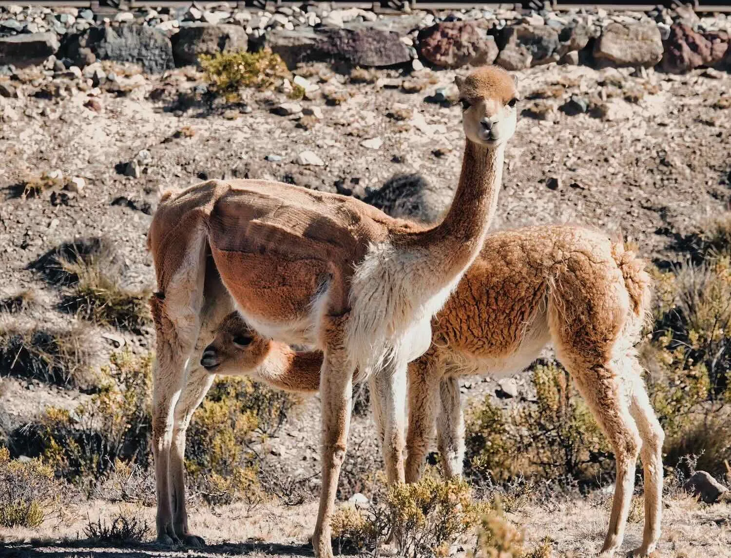 We were charmed by the sight of a mother vicuña nursing her calf. The mama’s luxurious wool was cut smooth from being recently sheared. Although all vicuñas are wild, some indigenous communities are allowed to round them up every 2-3 years for shearing. Vicuña wool is often described as the world’s softest natural fiber and more precious than gold. It is finer, more delicate, and more expensive than either alpaca or cashmere. Pampa Cañahuas National Reserve, W of Patahuasi, Arequipa Department, Peru. Copyright © 2019-2026 Pedals and Puffins.