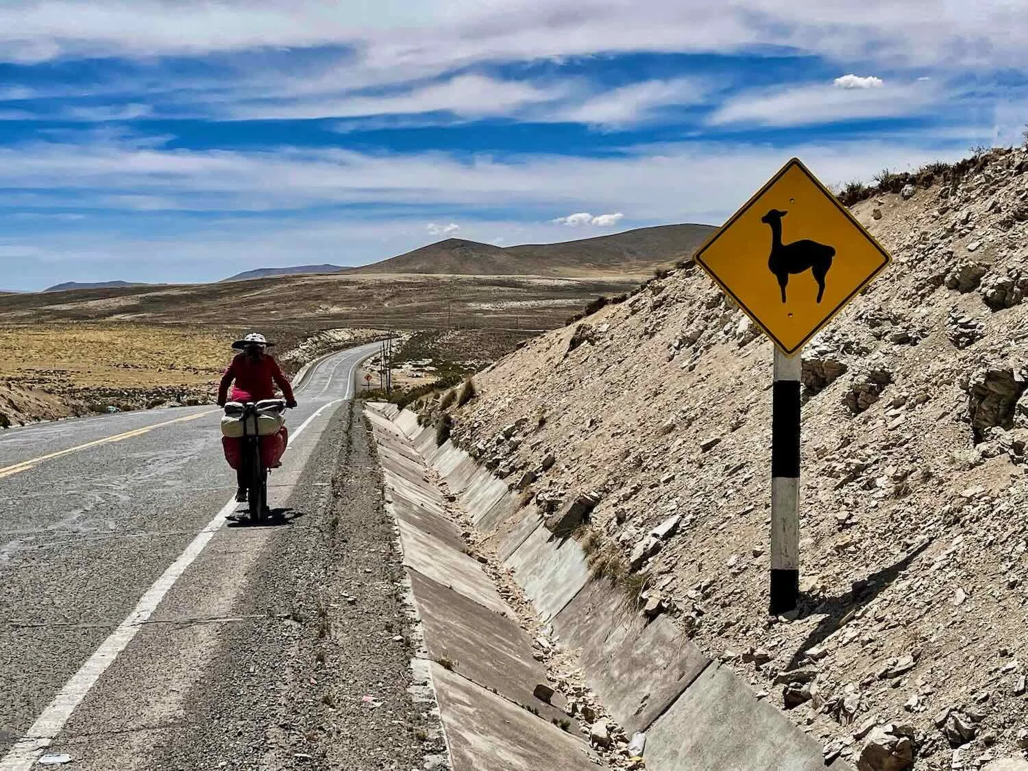 After cycling over a series of hills, we rolled onto a flat, high plain. This road sign indicated there would be more alpacas ahead. NE of Imata, Arequipa Department, Peru. Copyright © 2019-2026 Pedals and Puffins.