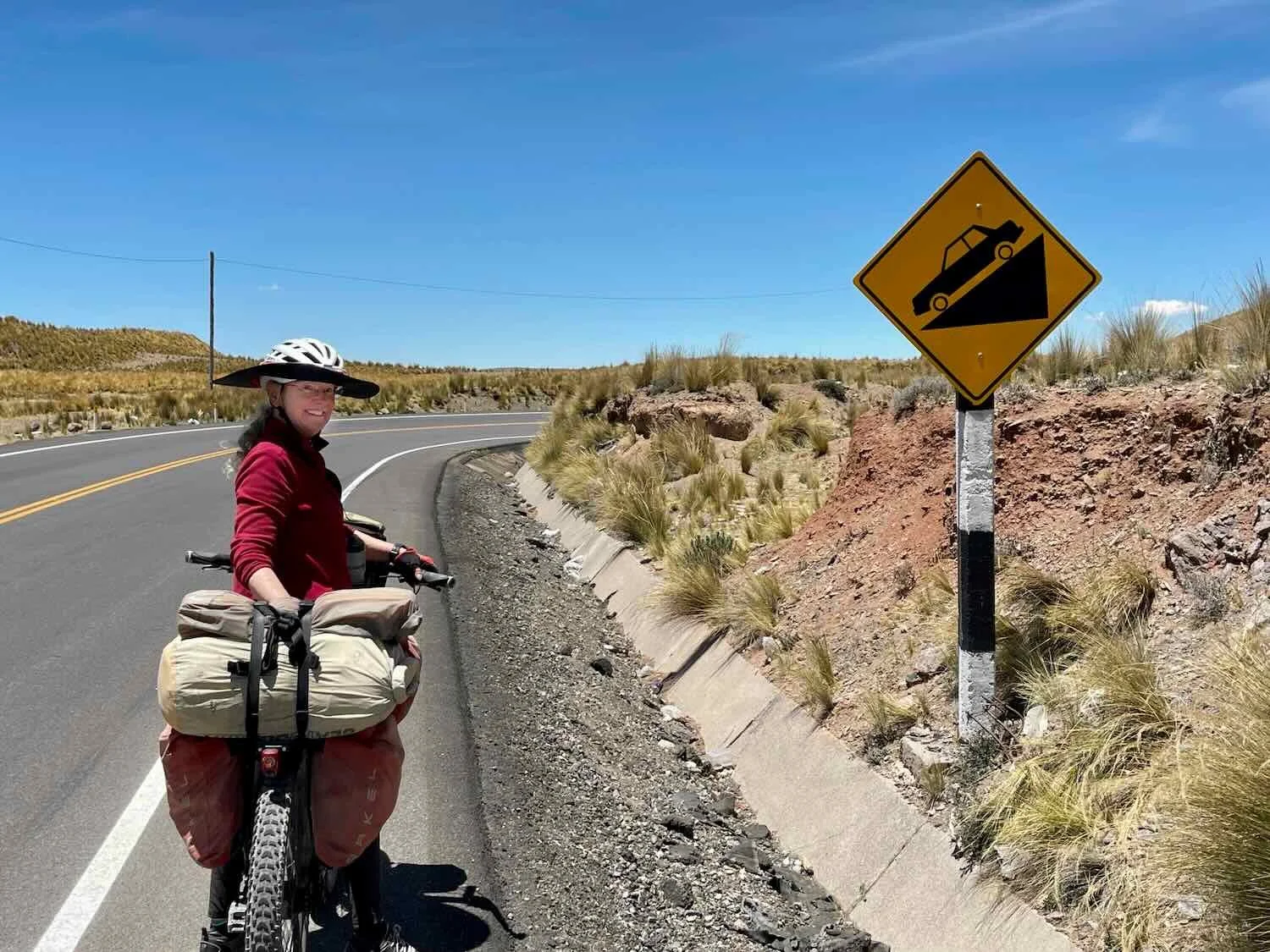All smiles at the top of the pass (14,510 ft). There’s nothing quite like a “downhill ahead” sign to lift your spirits. W of Santa Lucía, Puno Department, Peru. Copyright © 2019-2026 Pedals and Puffins.