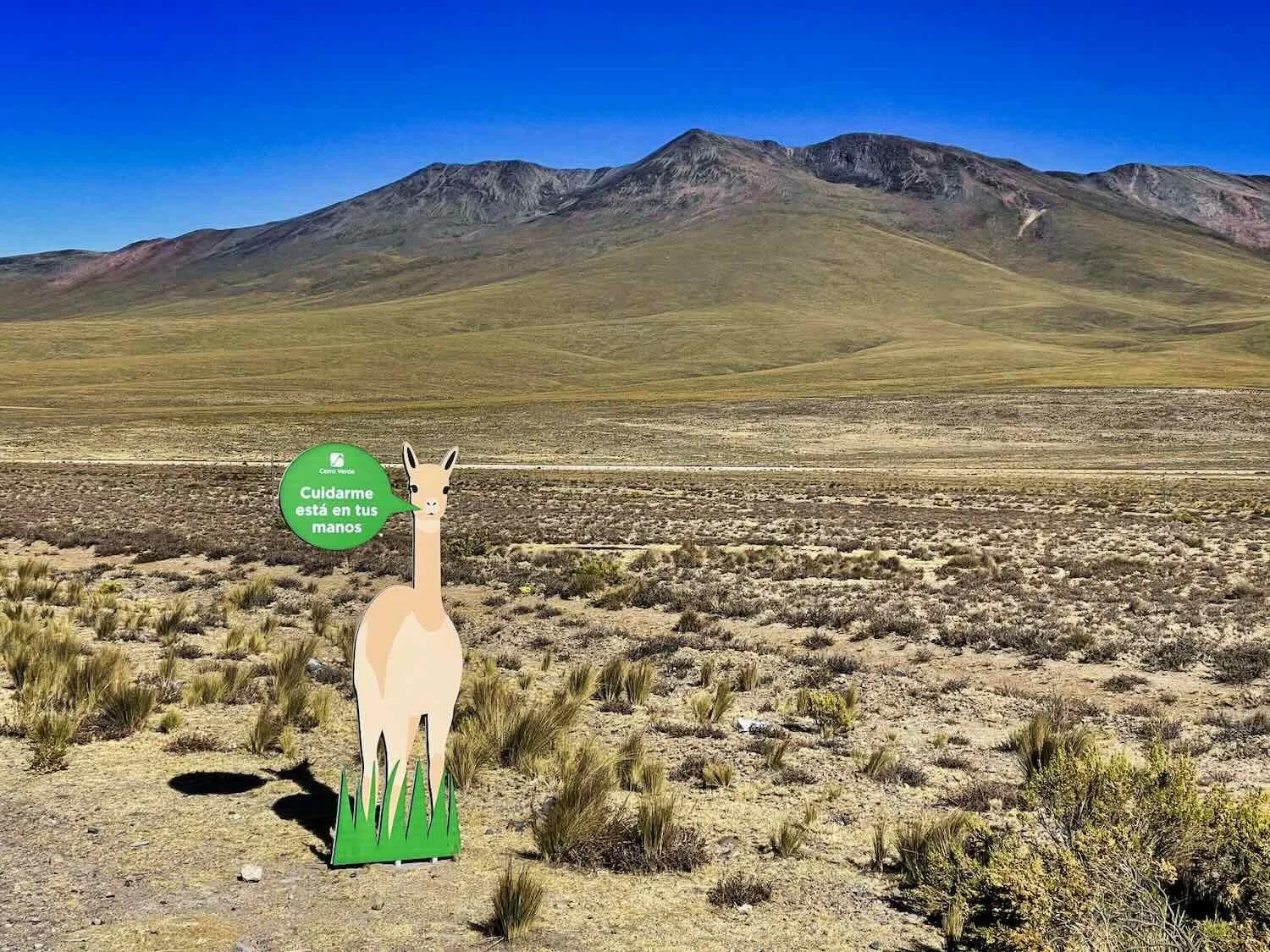 This cut-out of a vicuña says, “Taking care of me is in your hands.” Pampa Cañahuas National Reserve, W of Patahuasi, Arequipa Department, Peru. Copyright © 2019-2026 Pedals and Puffins.