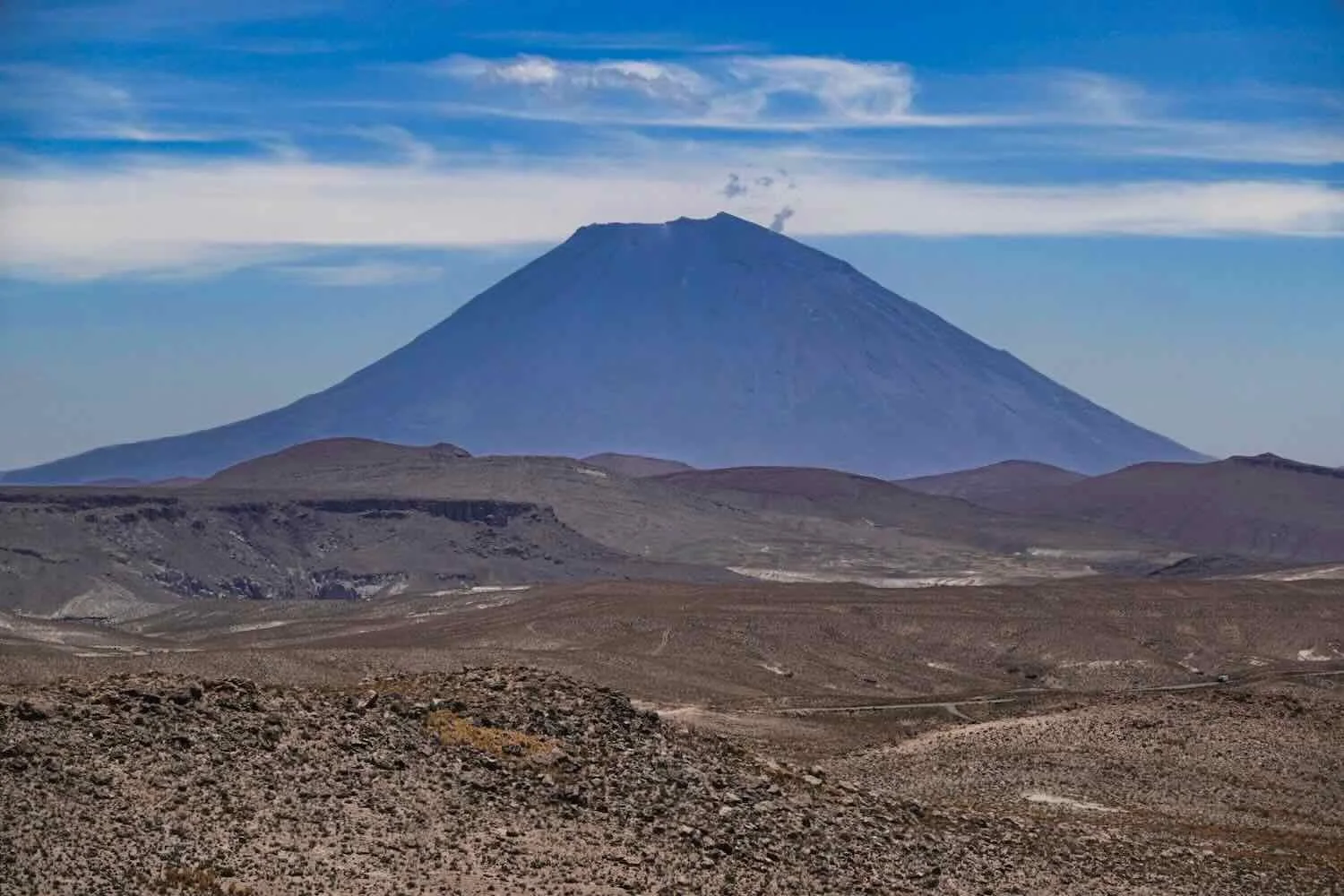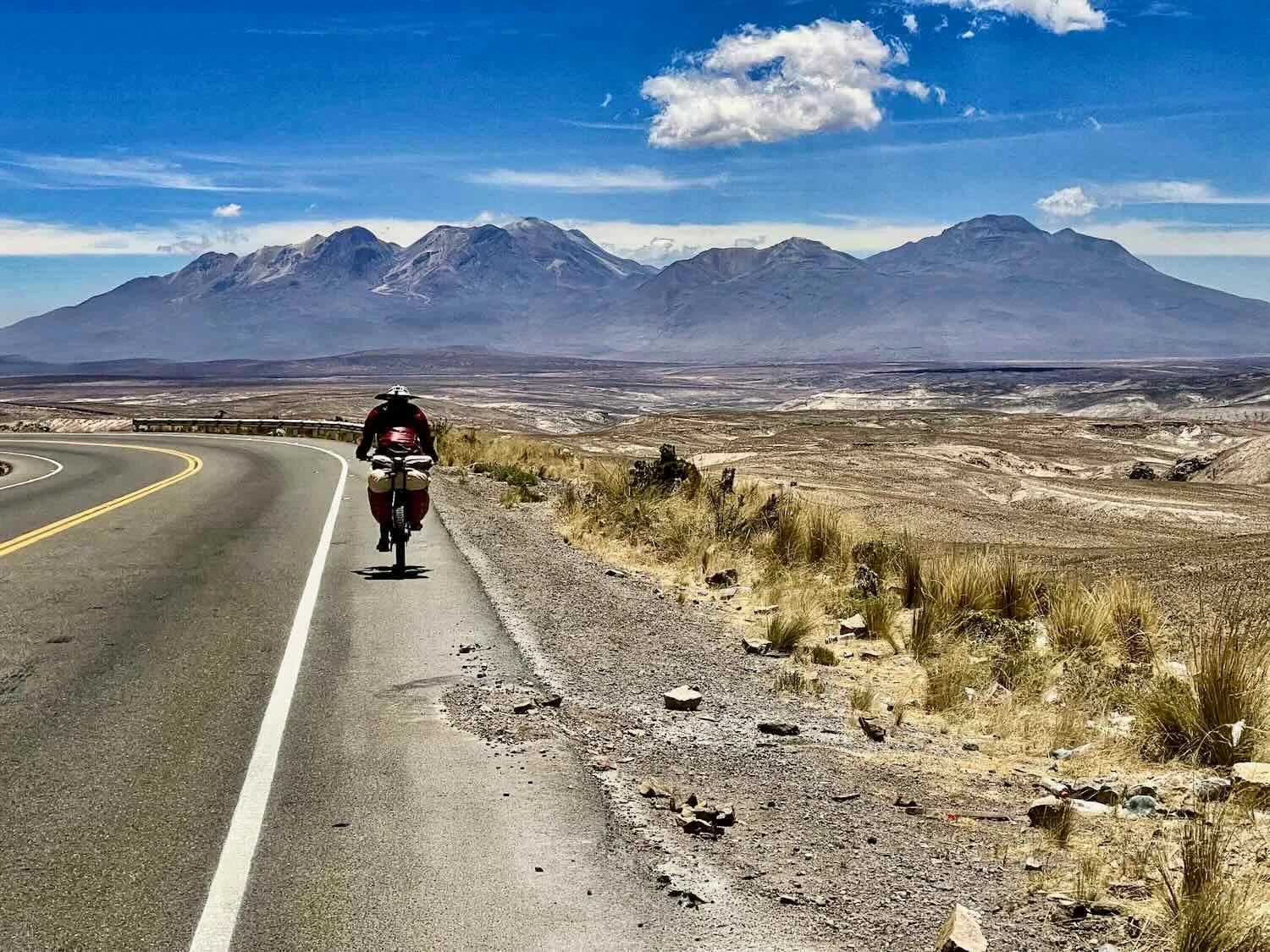 As we reached the edge of the plateau and began our descent, the rugged silhouette of the dormant Chachani volcanic complex rose up ahead of us. Mirador Carlitos, Arequipa Department, Peru. Copyright © 2019-2026 Pedals and Puffins.