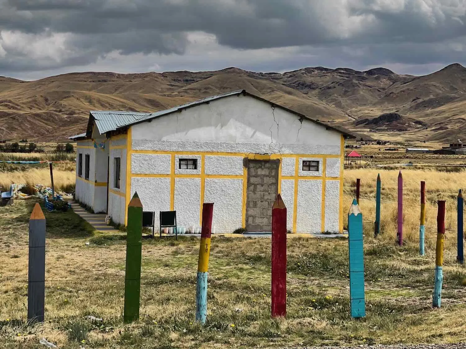 There were very few buildings in the grasslands. This community building stood out, with its cheerfully colored fence posts. We think this may have been a local school. Near Mañazo, Puno Department, Peru. Copyright © 2019-2026 Pedals and Puffins.