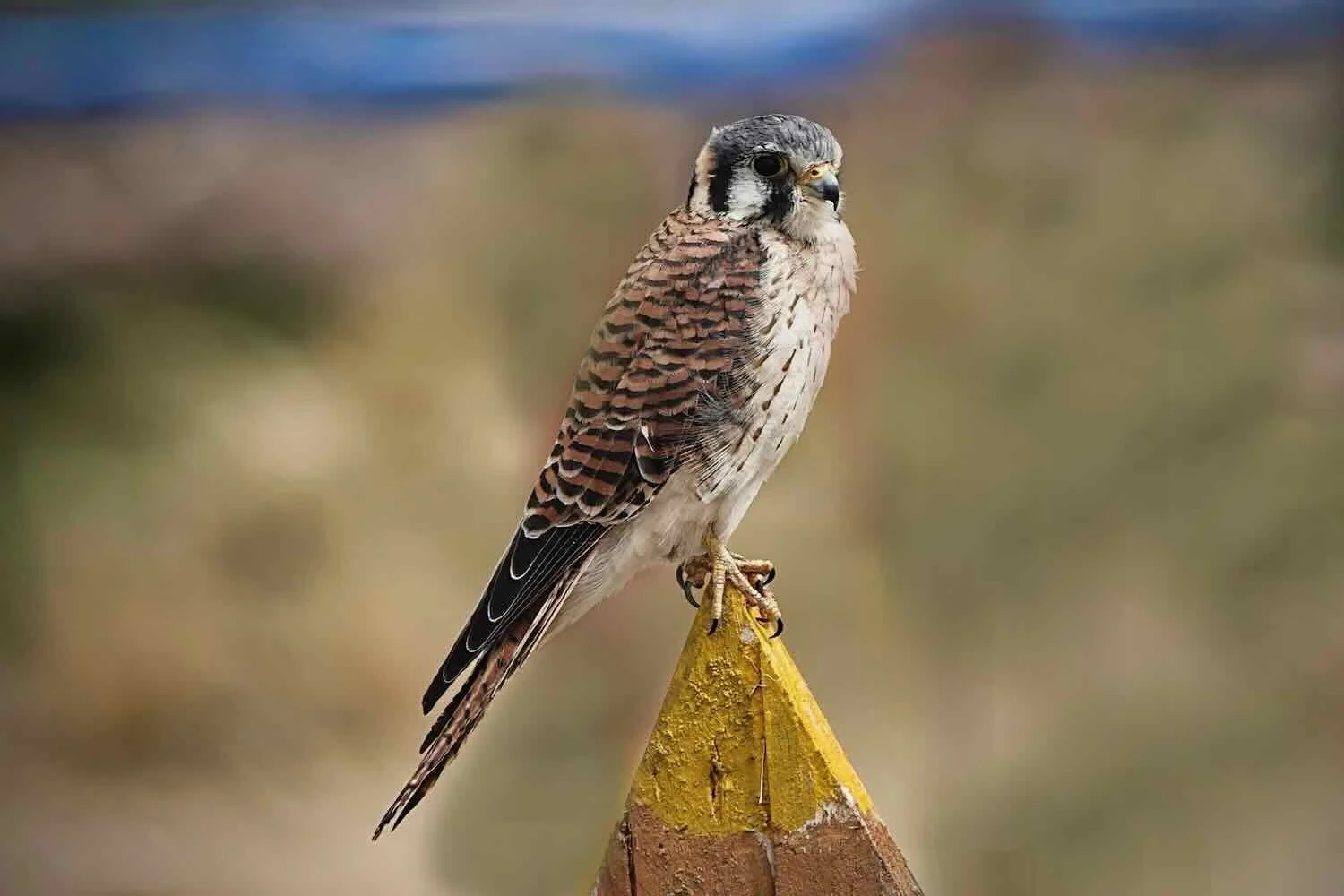 An American Kestrel perched on one of the painted fence posts. Kestrels were among the most common birds in this part of the altiplano, often seen perched on telephone poles or electrical wires bordering the road. They usually would fly off before a picture could be taken, so we were lucky with this one. Near Mañazo, Puno Department, Peru. Copyright © 2019-2026 Pedals and Puffins.