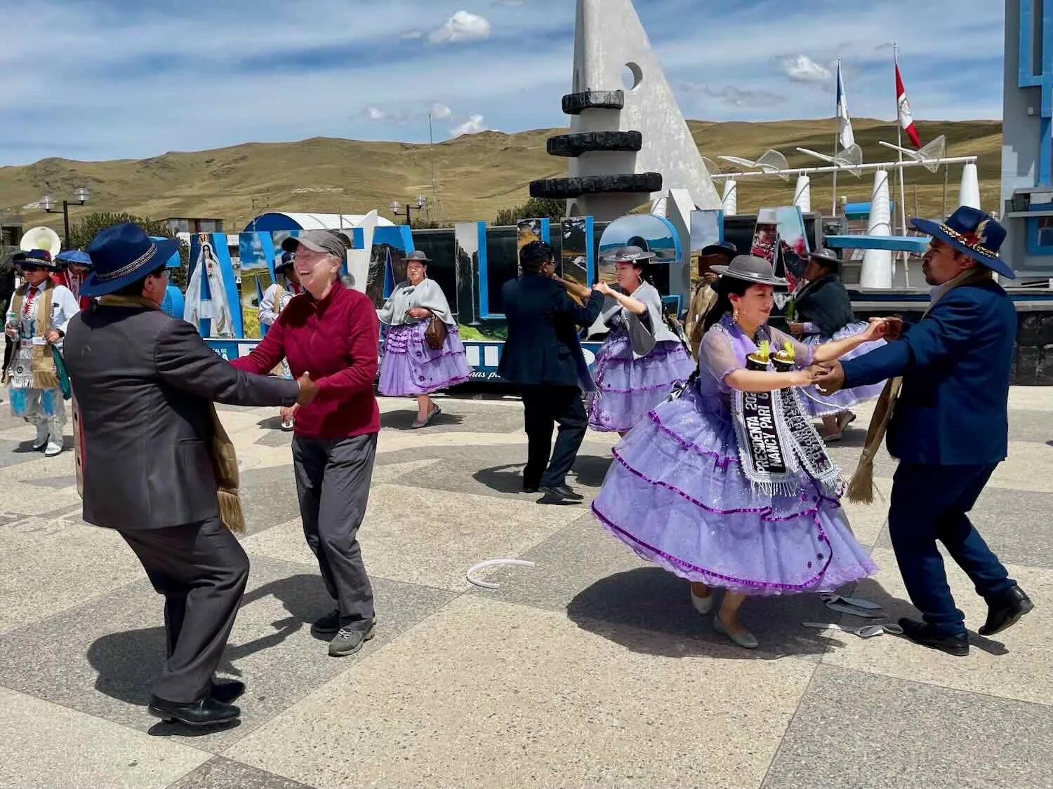 The afternoon of our arrival in Santa Lucía, a local, religious fraternity was out dancing in the main plaza to promote an upcoming festival. When one of the gentlemen asked PedalingGal to join in the dancing, he wouldn’t take “no” for an answer. A lady in dance costume even conned PedalingGuy into a dance or two. We were a little under-dressed for the event, but that didn’t seem to matter. Santa Lucía, Puno Department, Peru. Copyright © 2019-2026 Pedals and Puffins.
