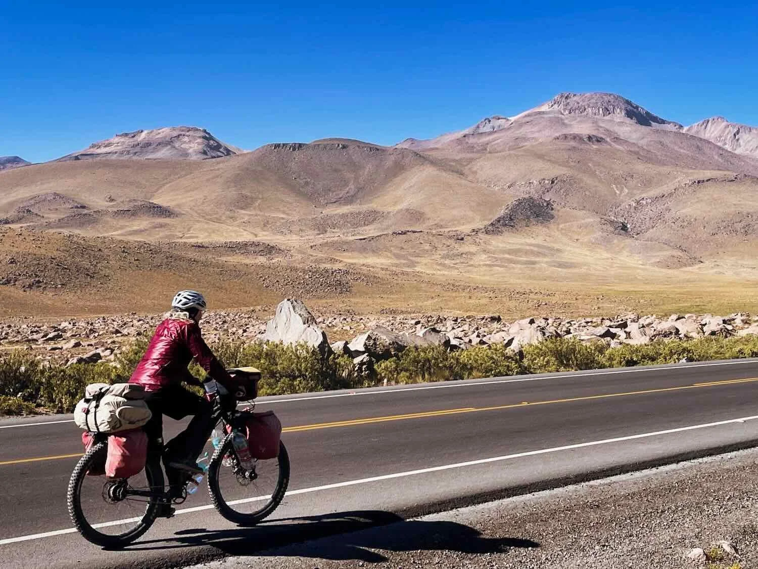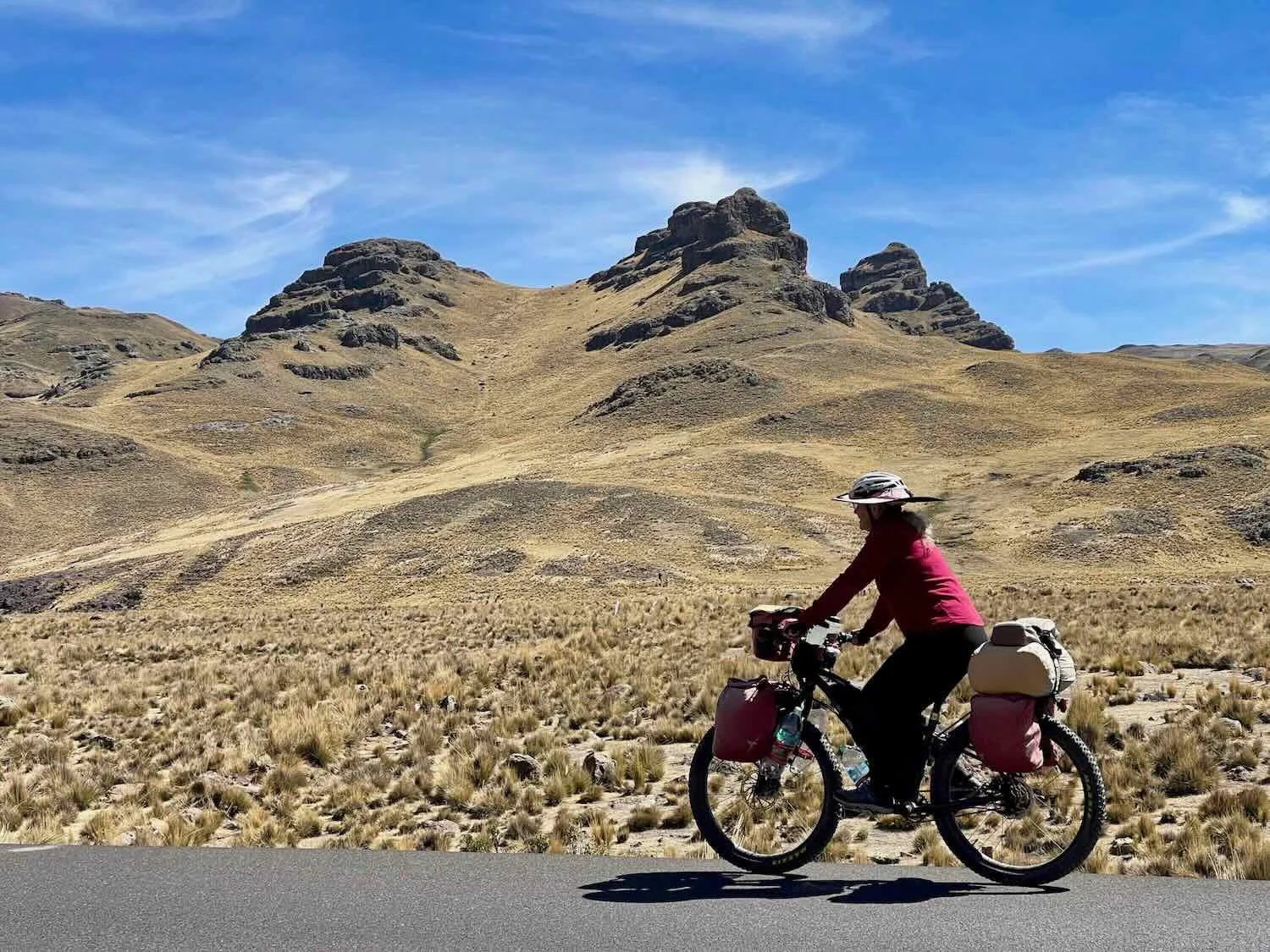 Cycling through the grasslands on the beautiful, smooth, new road surface. The paving was so fresh, they hadn’t yet painted new lines on the road. W of Santa Lucía, Puno Department, Peru. Copyright © 2019-2026 Pedals and Puffins.
