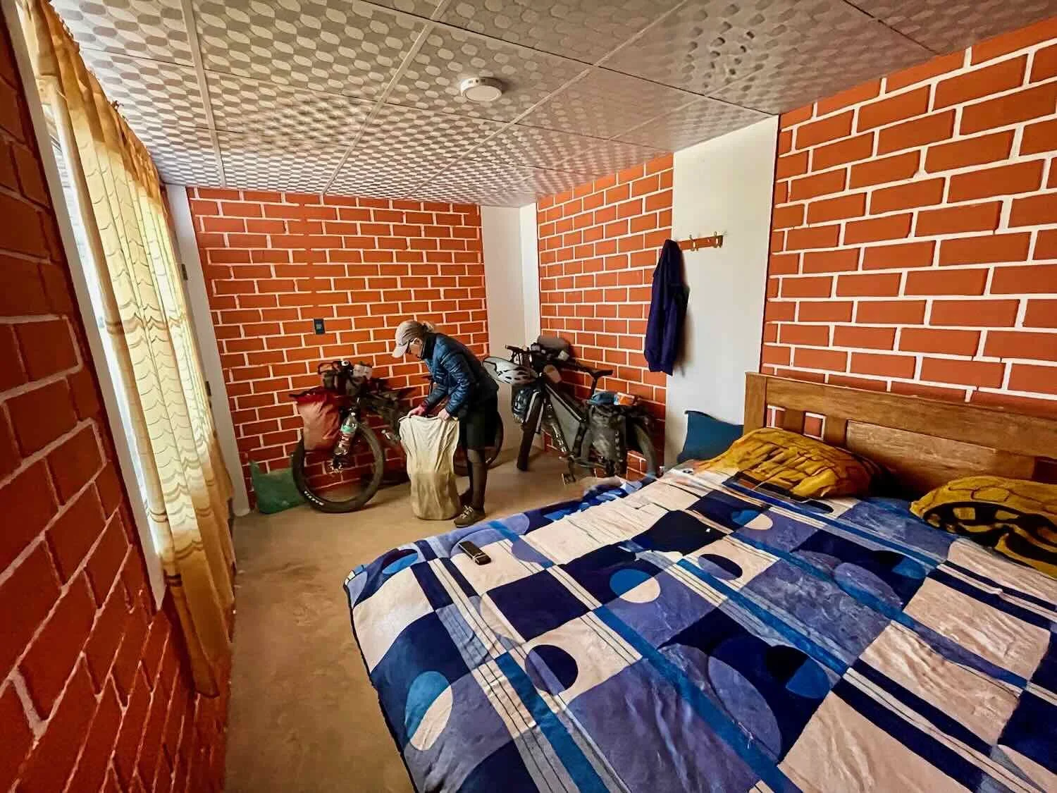 This hospedaje was a very simple place, but it was perfect as an emergency stop for the night. In fact, the building seemed very new, and was still under construction in places. Behind the grandly carved, wooden door the entryway was strewn with debris ranging from jerrycans, to slabs of tile, piles of bricks, metal beams, you name it. But the room itself was very tidy and huge (lots of space for the bikes, and we even set up our camp chairs), with fresh-looking, brick walls and a surprisingly new, comfy bed. For the price of US$9 per night, you couldn’t beat it.