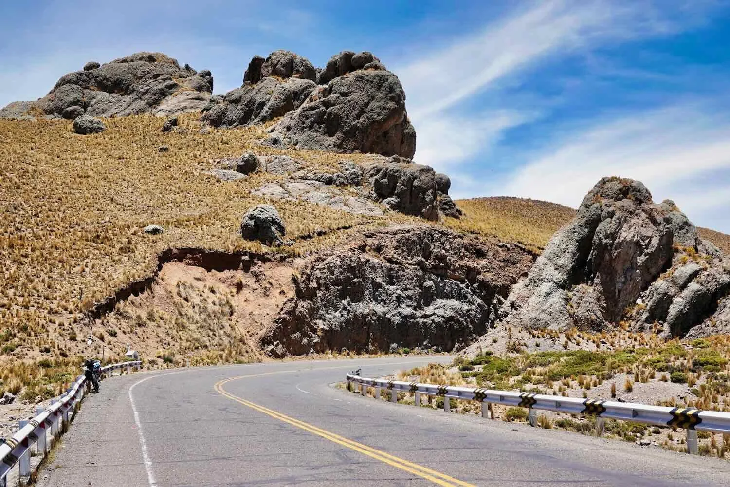 This mangled guardrail was a reminder that these roads could be dangerous at times. Accidents often happen at night, when drowsy drivers overshoot curves in the dark. These roads can even get icy in the austral winter, making the curves that much more treacherous. Totorani Curve, Puno Department, Peru. Copyright © 2019-2026 Pedals and Puffins.