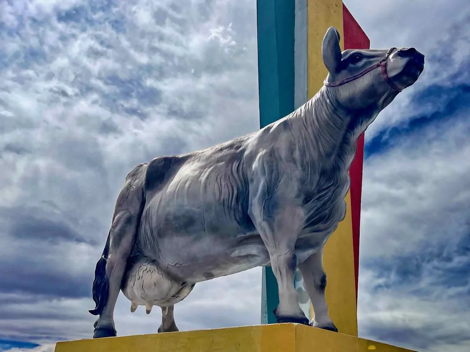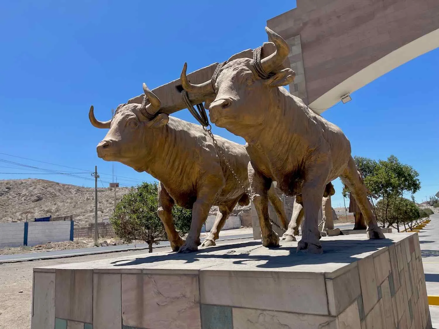 A majestic-looking cow statue at the entrance reinforced the town’s historical connection to the commercial livestock business. Mañazo, Puno Department, Peru. Copyright © 2019-2026 Pedals and Puffins.