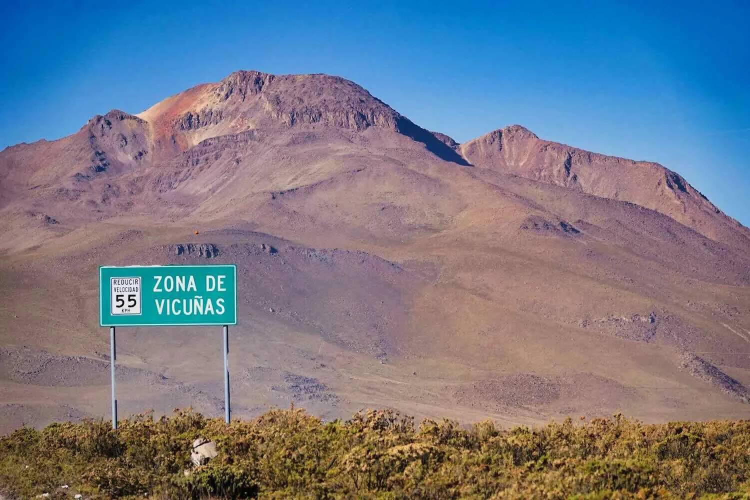 We knew to keep a watchful eye out for vicuñas when we saw this sign. Pampa Cañahuas National Reserve, W of Patahuasi, Arequipa Department, Peru. Copyright © 2019-2026 Pedals and Puffins.