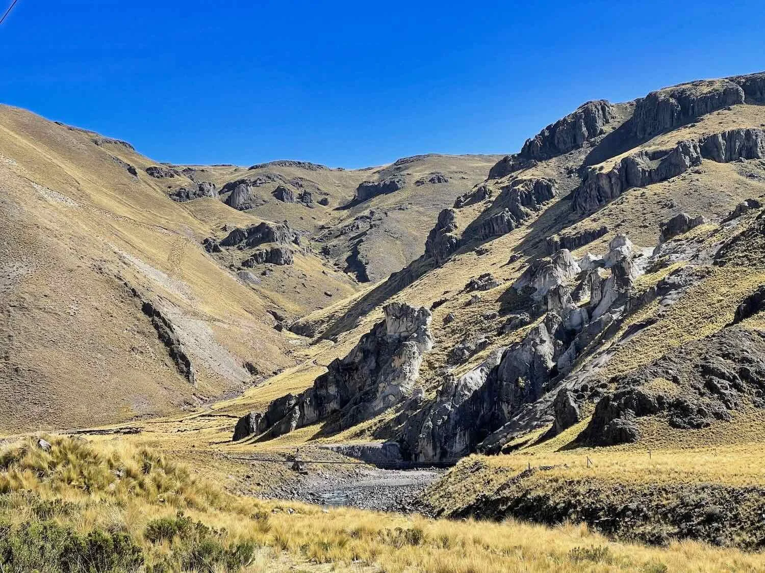 Rugged, rocky outcrops broke through the grasslands at higher elevations. Verde River Valley, W of Santa Lucía, Puno Department, Peru. Copyright © 2019-2026 Pedals and Puffins.