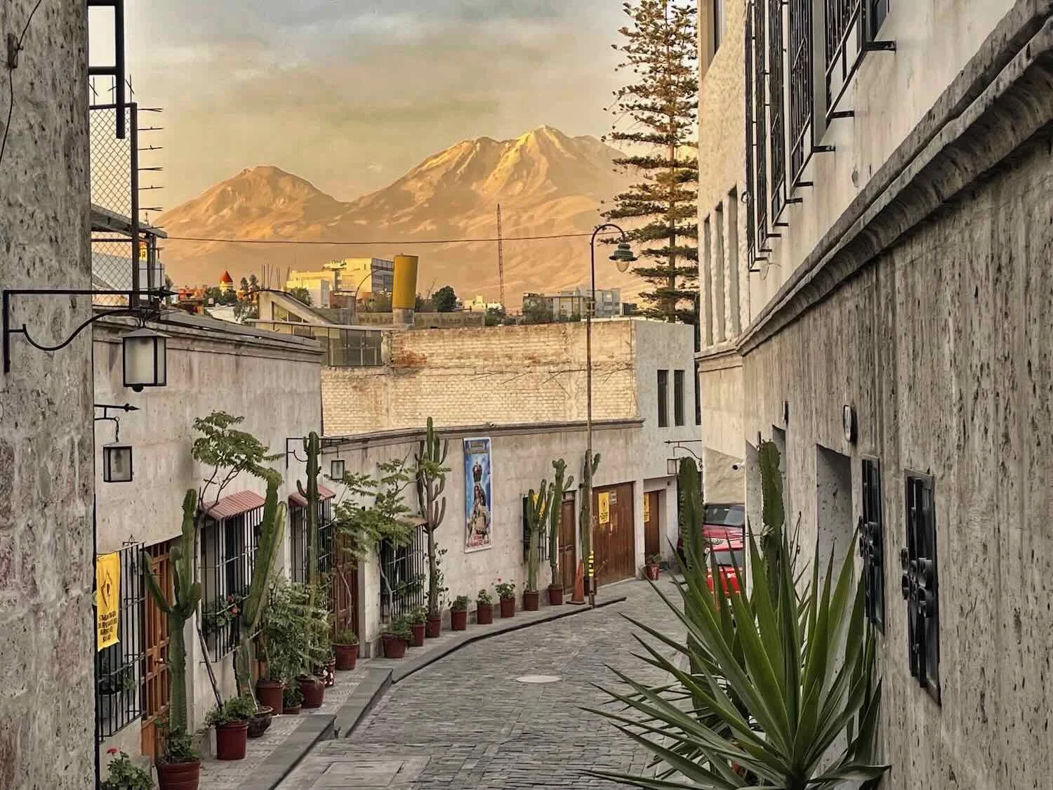 Morning light cast a warm glow on the Chahani Volcano, seen from a quiet alley in old town. Puerta del Puente, City of Arequipa, Peru. City of Arequipa, Peru. Copyright © 2019-2026 Pedals and Puffins.