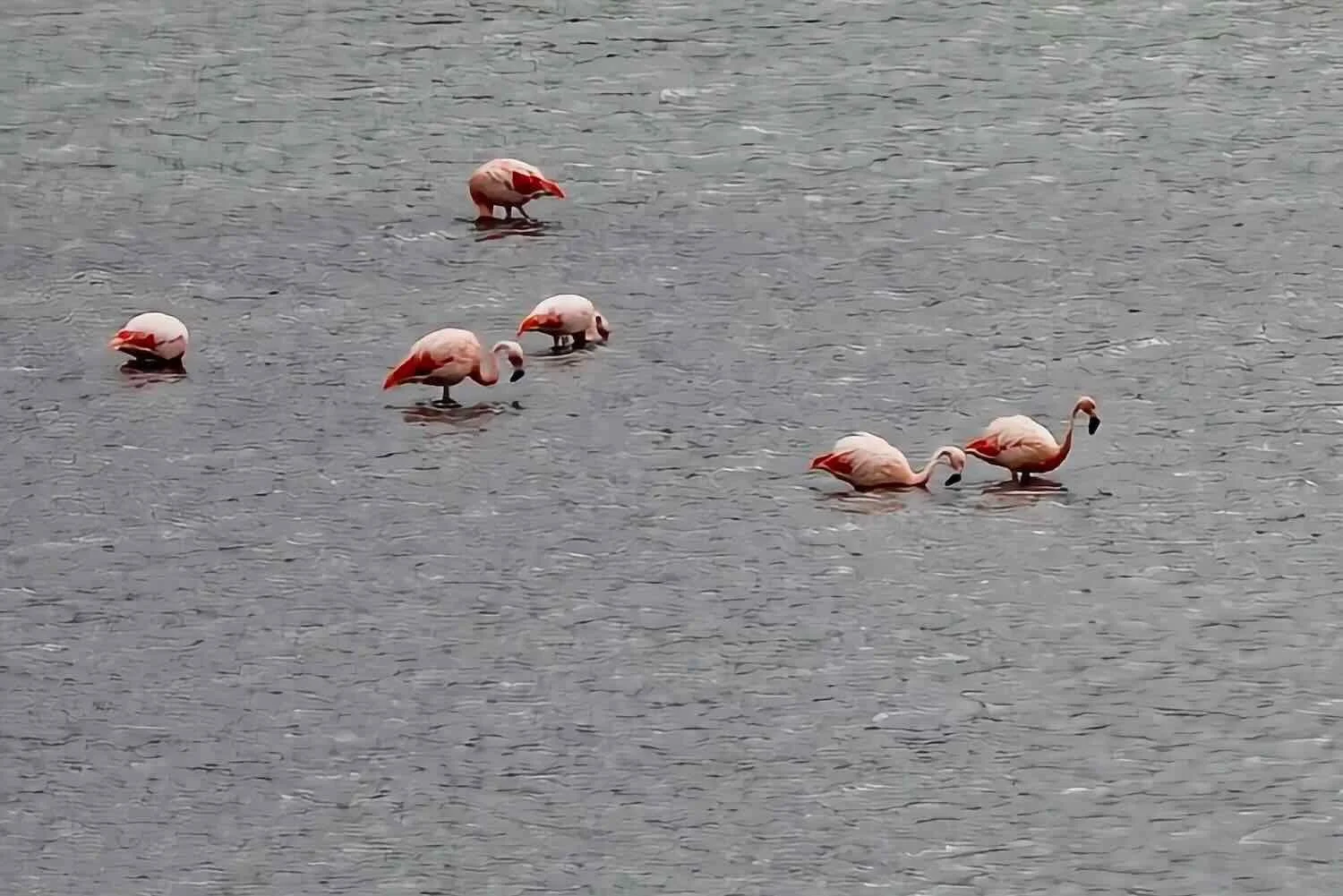 Moments later we encountered one of our highlights of the day. As we cycled around a bend in the road, a shallow, saline lake came into view. Scattered throughout the water were the big, pink, fluffy shapes of flamingos! These birds can occur all the way down to Tierra del Fuego, but they had eluded us so far. They weren’t very close to the road, but fortunately flamingos are unmistakable. There must have been a lot of food in that little lake, because all the birds had their heads down in the water, eating. It took some patience to wait for a few of them to raise their heads so we could get a distant photo.
