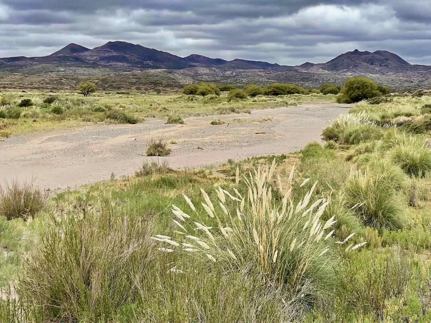 The approaching weather front brought a thick, gray layer of clouds. Grass fronds along a dry riverbed waved in the wind. Route 40, Arroyo China Muerta, Neuquén, Argentina. Copyright © 2019-2025 Pedals and Puffins.