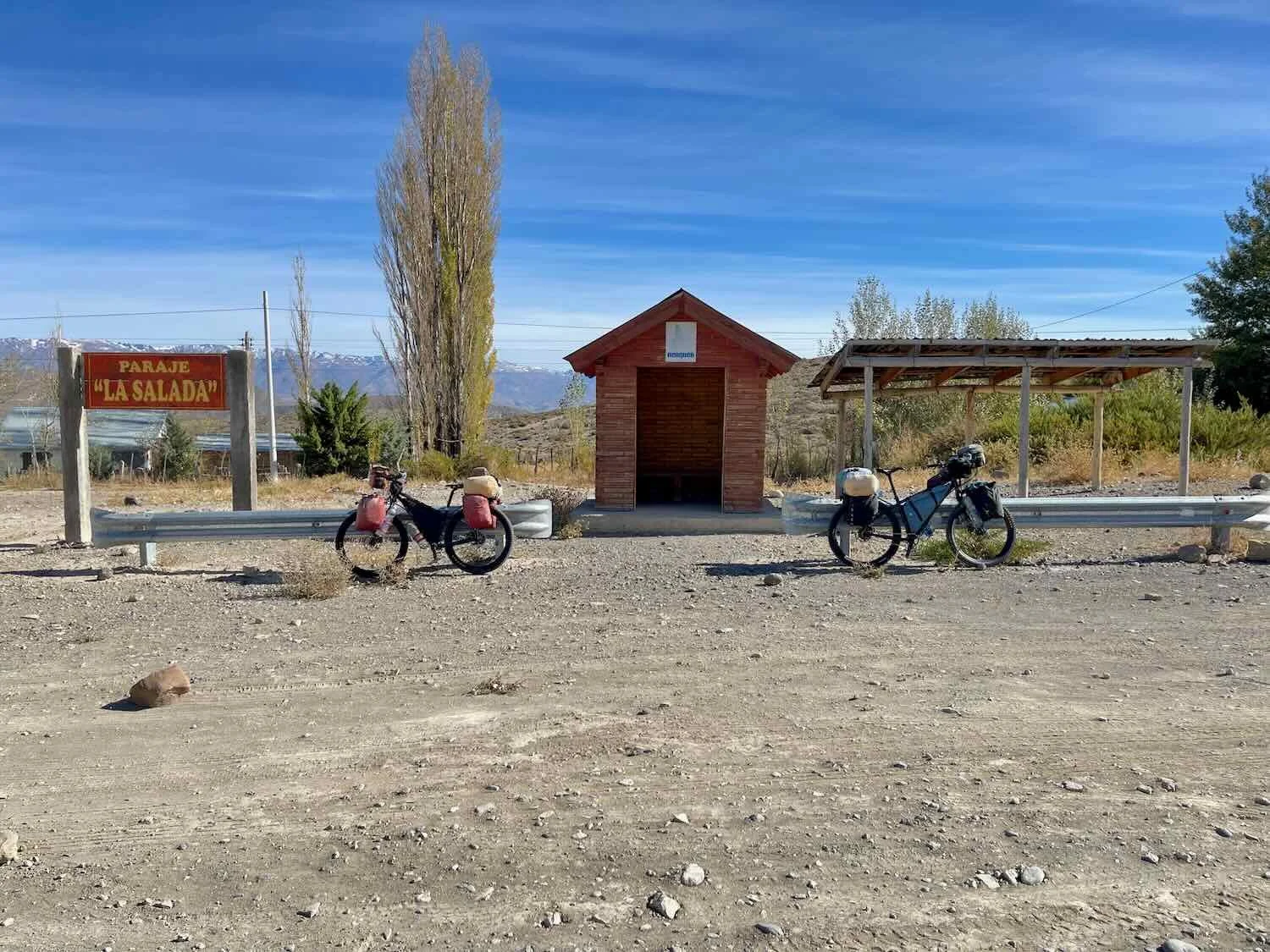 A little over an hour into our ride we stopped for a break at this miniature, rural bus stop. Even while we were resting, passing drivers would honk and wave in encouragement. Route 40, La Salada, Neuquén, Argentina. Copyright © 2019-2025 Pedals and Puffins.