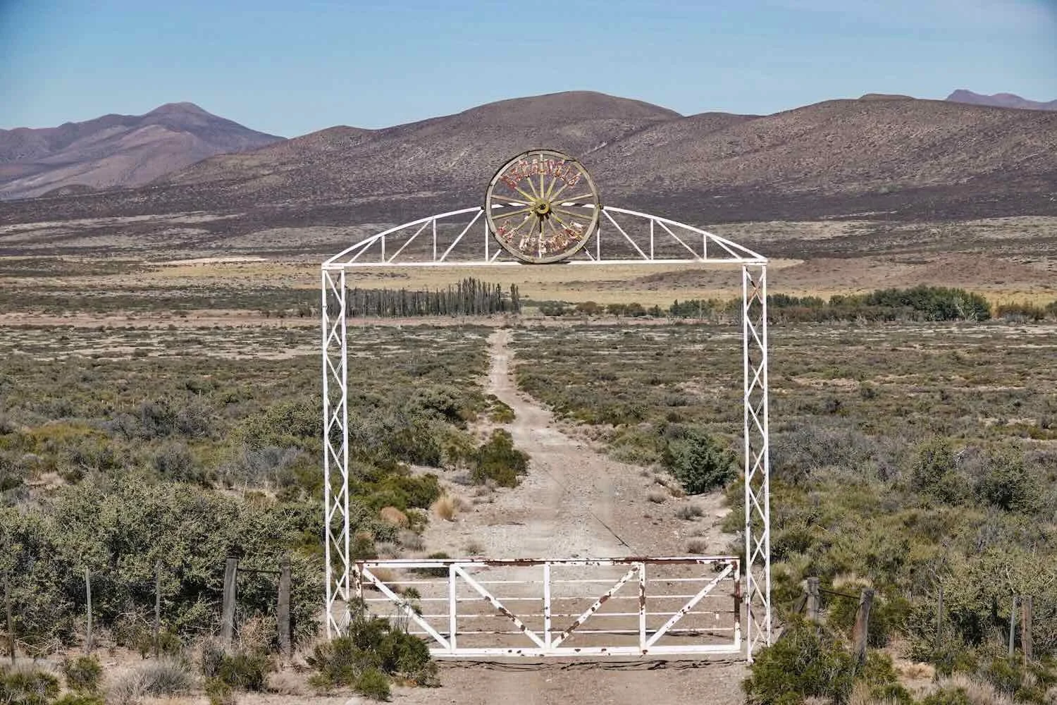 This elaborate gate marked the entrance to a homestead, tucked back among the poplars in the distance. Fancy gates were not as common here as in some countries, but every so often we would pass one. Route 40, East of La Salada, Neuquén, Argentina. Copyright © 2019-2025 Pedals and Puffins.