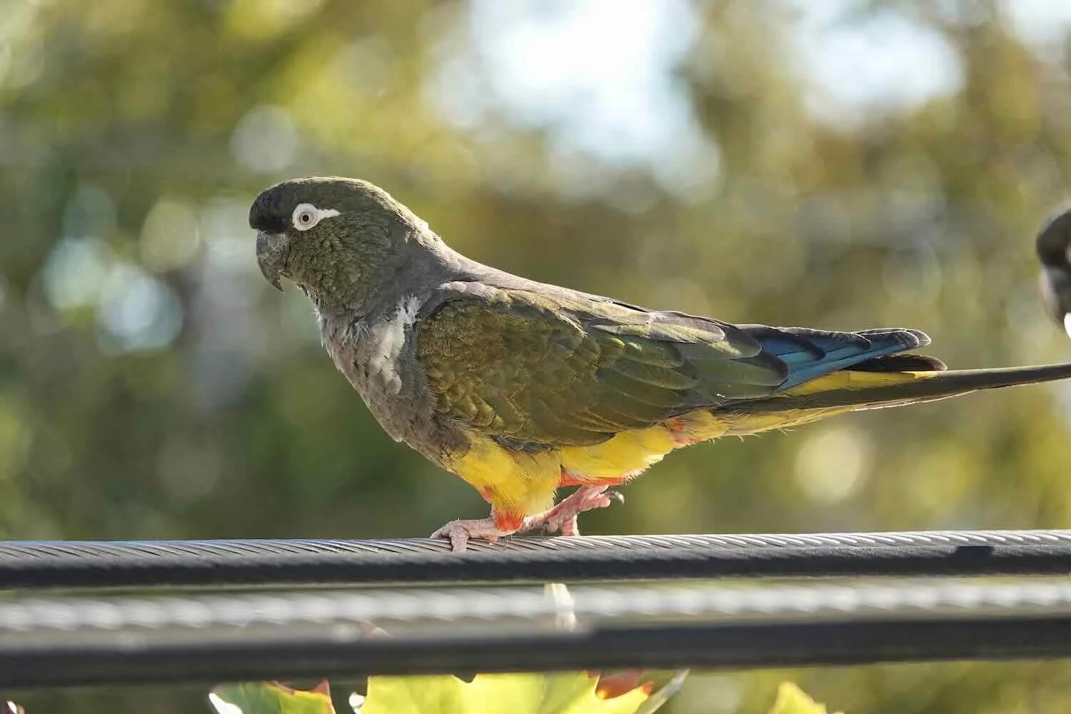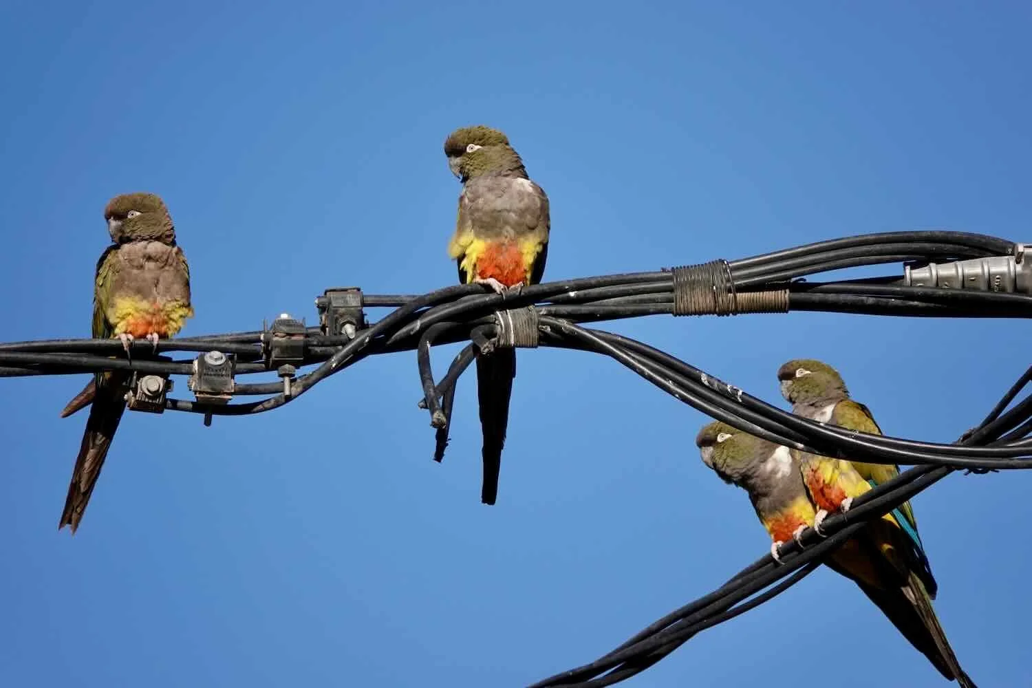 Burrowing parakeets, just sitting on the wires (rather than chewing on them). Paseo Costanero, Chos Malal, Neuquén, Argentina. Copyright © 2019-2025 Pedals and Puffins.