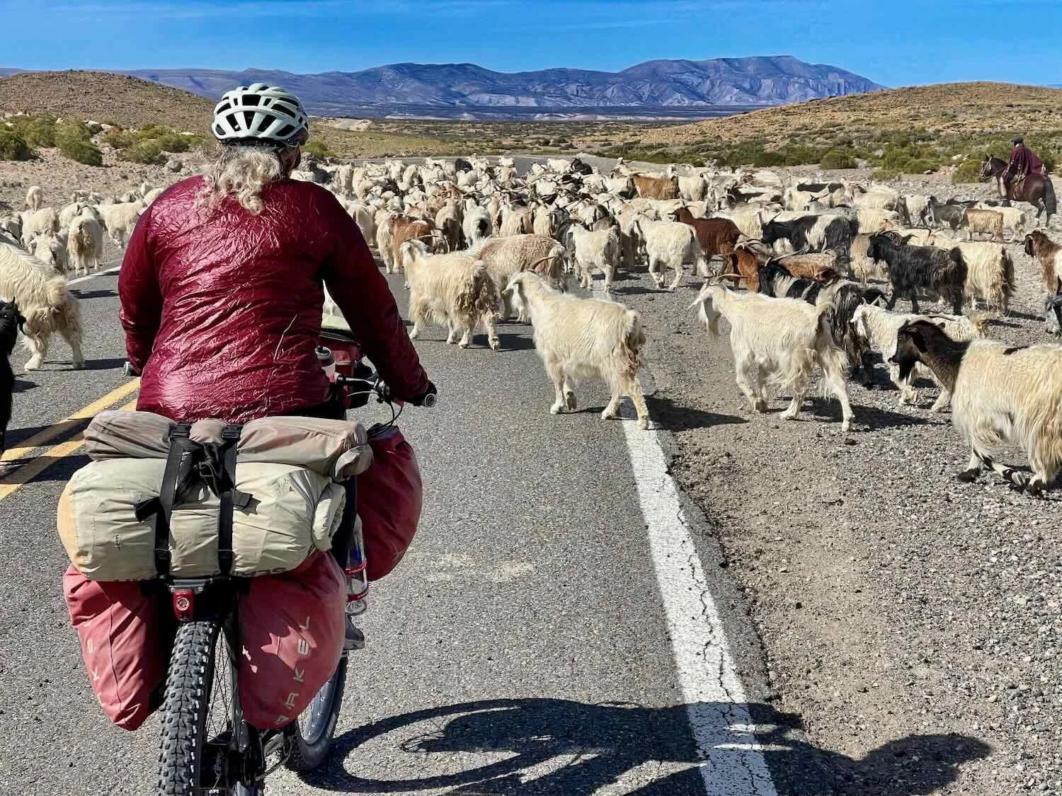 We encountered even more gauchos driving their goats (and in this case, a few horses) along the road. Route 40, South of Buta Ranquil, Neuquén, Argentina. Copyright © 2019-2025 Pedals and Puffins.