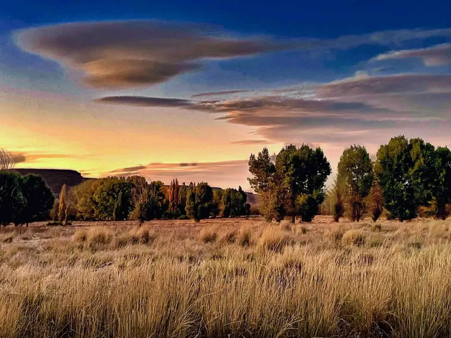 A lovely sunset, seen from our campsite among the cottonwood trees. Route 40, Catán Lil, Neuquén, Argentina. Copyright © 2019-2025 Pedals and Puffins.
