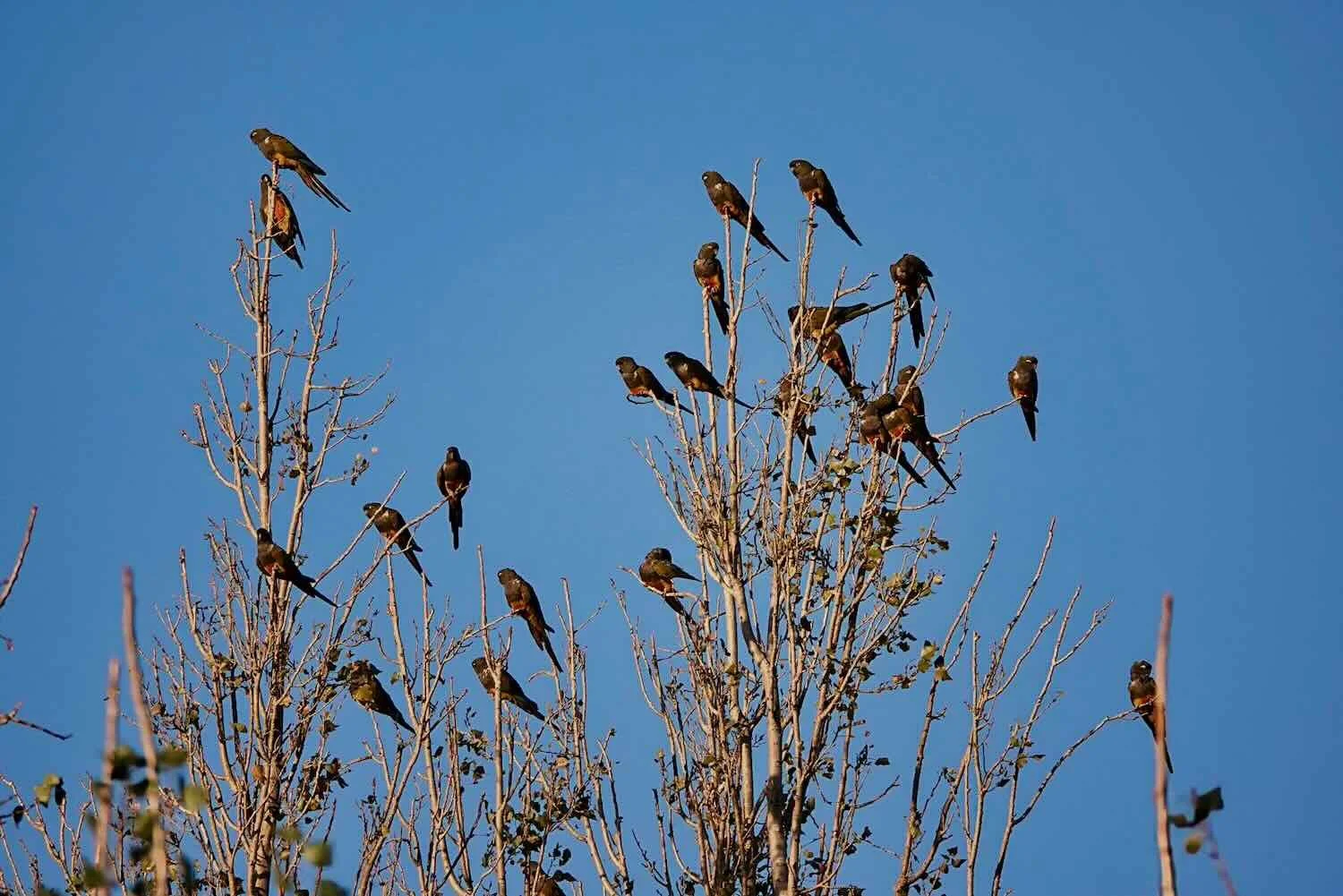 Flocks of Burrowing Parakeets started to gather in the tall trees near our cabin. Route 40, Las Lajas, Neuquén, Argentina. Copyright © 2019-2025 Pedals and Puffins.