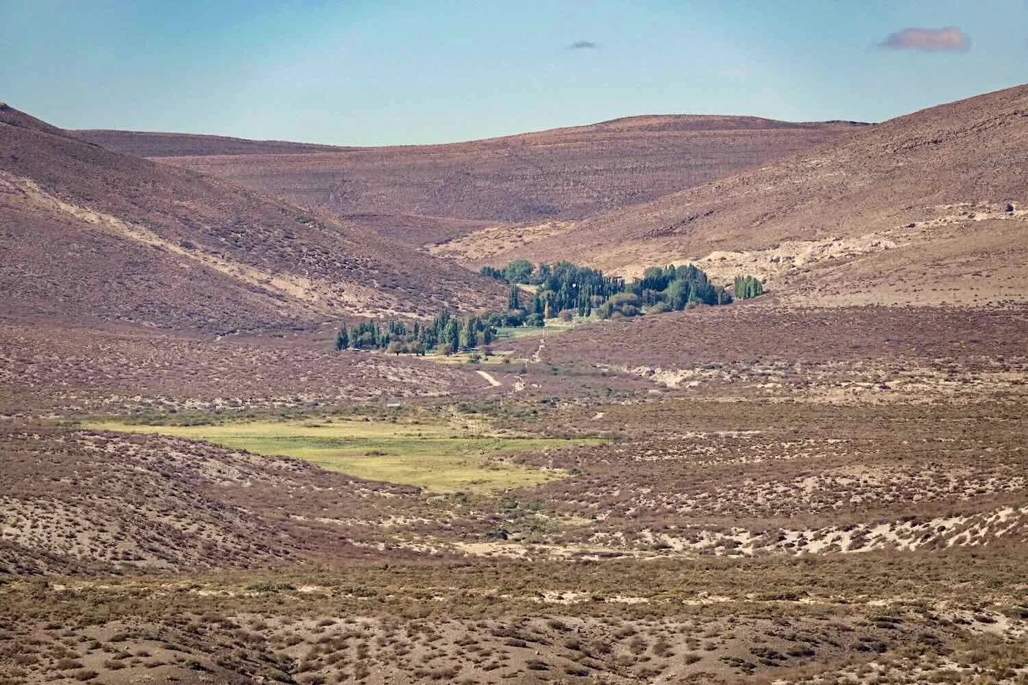 These days, any bit of water can transform the landscape. This homestead on the far side of a river valley must have had some water near the surface, supporting a grove of trees and even a patch of green grassland that looked anomalous among the beige hills. Route 40, East of Las Lajas, Neuquén, Argentina. Copyright © 2019-2025 Pedals and Puffins.