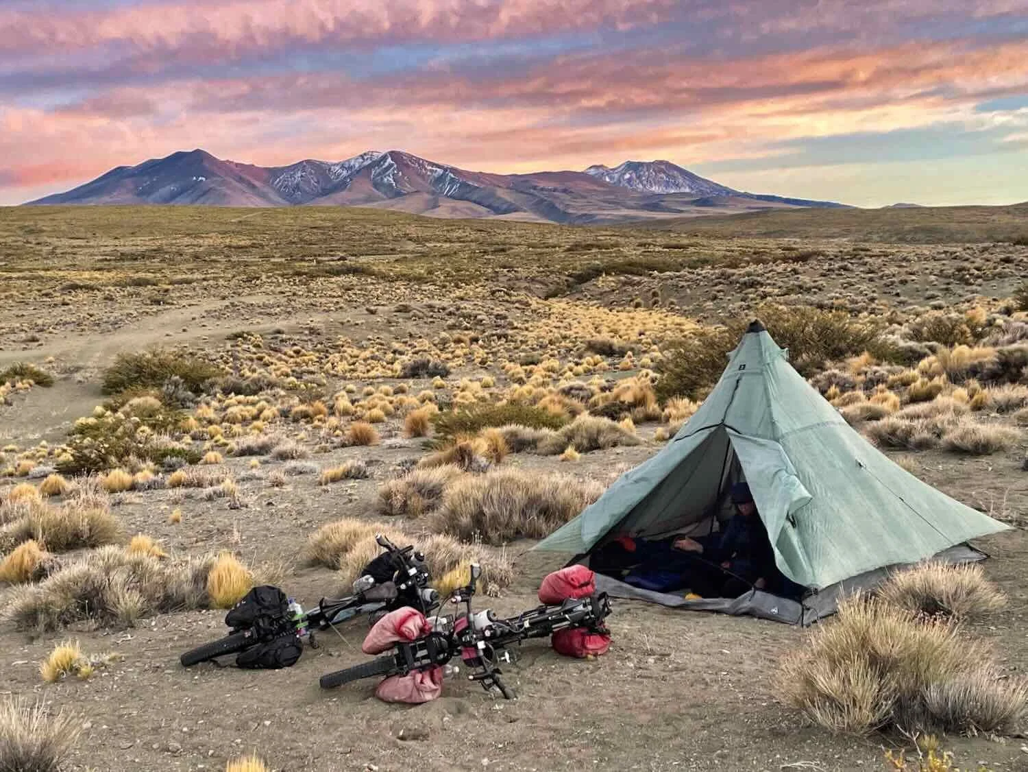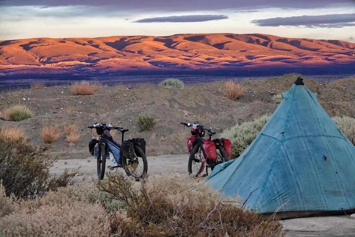 Sunset cast a warm glow on the surrounding hills near our campsite. The gravel berm just beyond our bikes blocked our tent from the view of passing cars. Route 40, Salado River Valley, South of Chorriaca, Neuquén, Argentina. Copyright © 2019-2025 Pedals and Puffins.