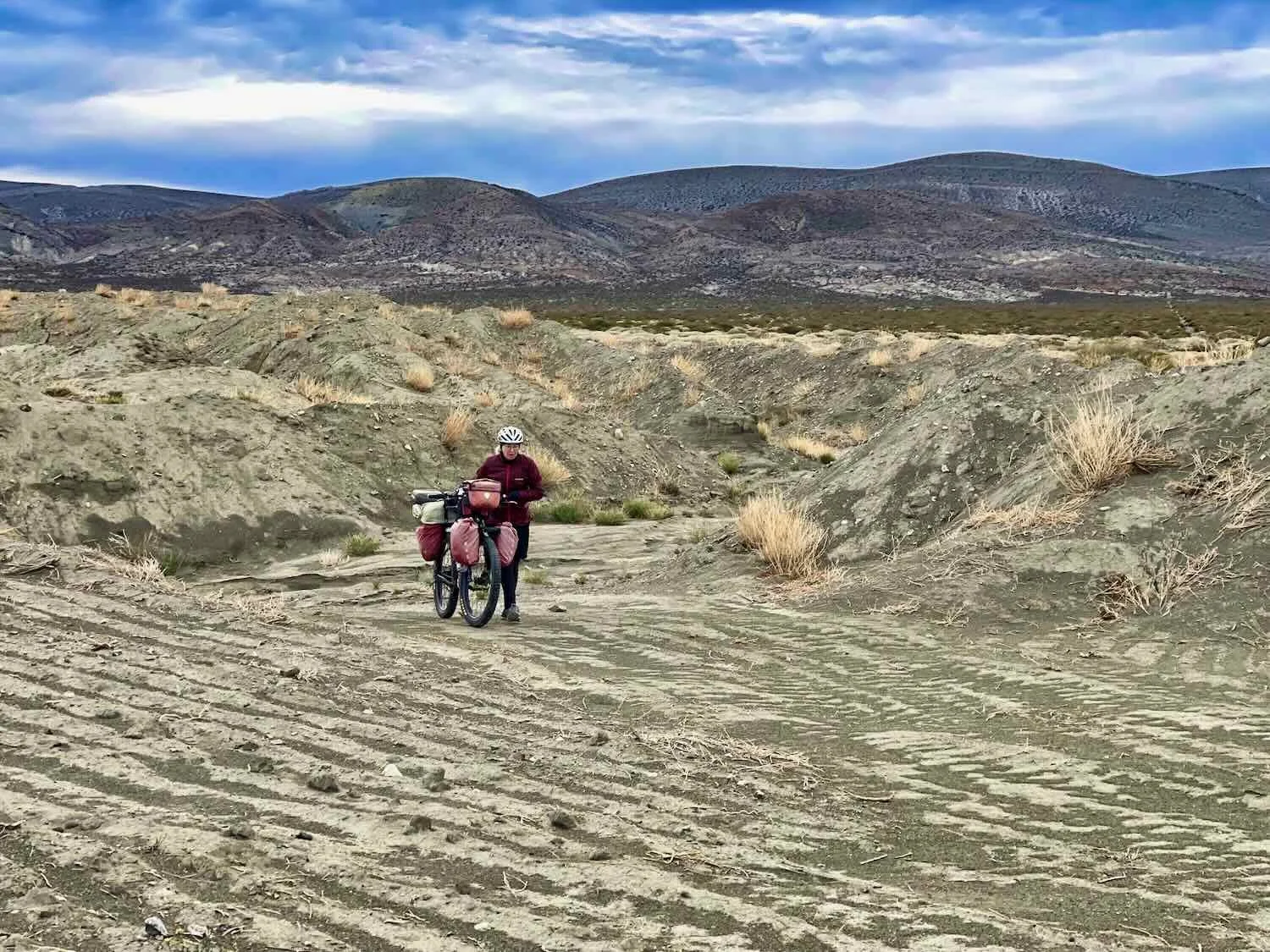 Pushing the bike back to the road, from our campsite behind the gravelly berm. Route 40, Salado River Valley, South of Chorriaca, Neuquén, Argentina. Copyright © 2019-2025 Pedals and Puffins.