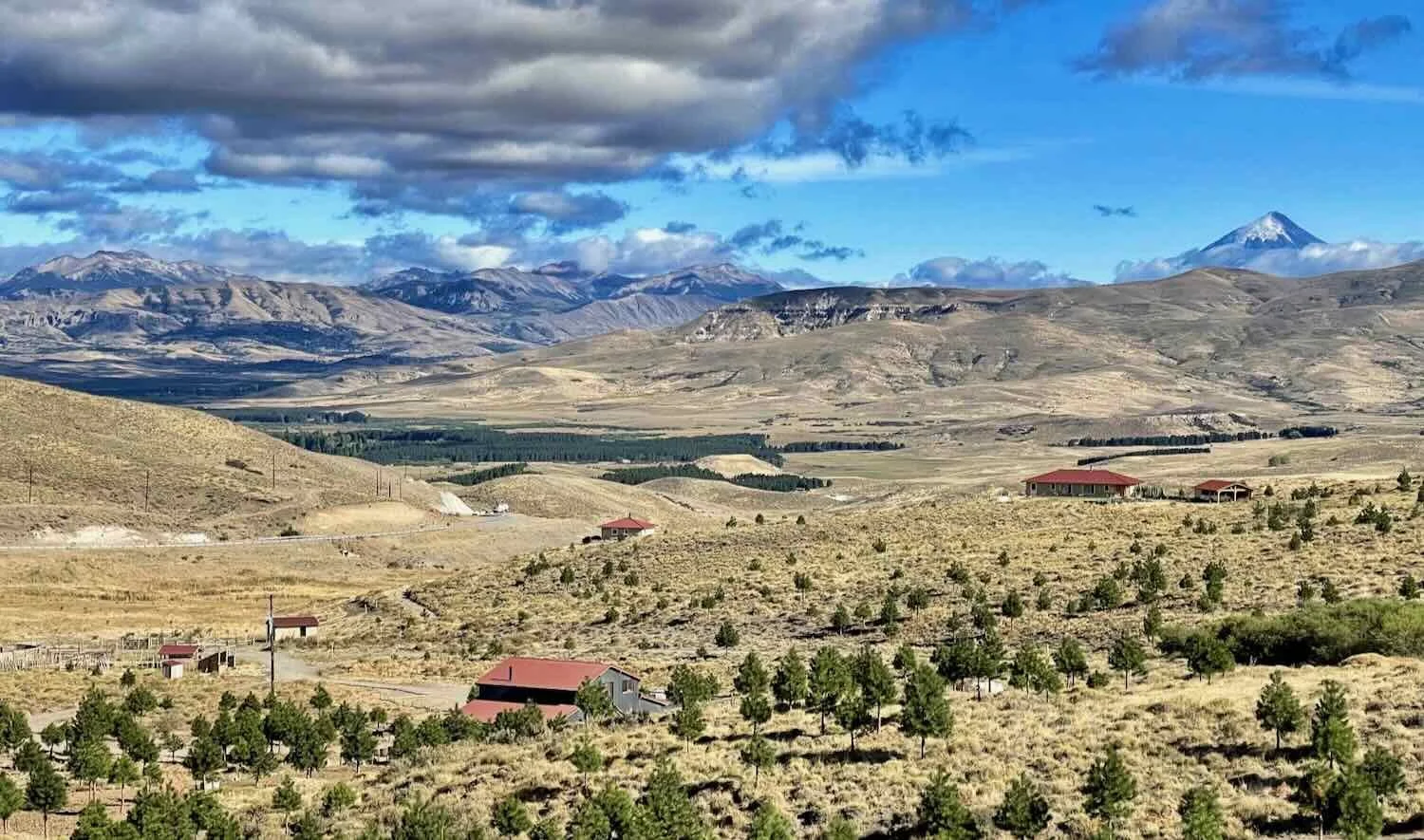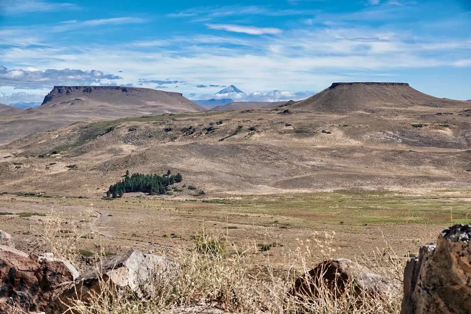 View towards the Chico mesas. The isolated, dark green woodland was a sure sign that there was a homestead among the trees (and that the trees were planted by people). The slight green wash to the grass in the valley was another indicator that there must be water near the surface down there. The Lanín Volcano can be seen between the buttes. Route 40, La Rincónada, Neuquén, Argentina. Copyright © 2019-2025 Pedals and Puffins.