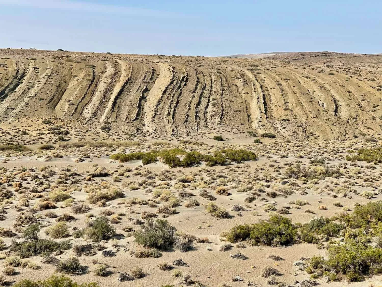 Along the route we saw these amazing, wavy rock formations. It looked like the layers of rock had been tipped up vertically, then smashed like an accordion into a ruffle of rock. Route 40, South of Buta Ranquil, Neuquén, Argentina. Copyright © 2019-2025 Pedals and Puffins.