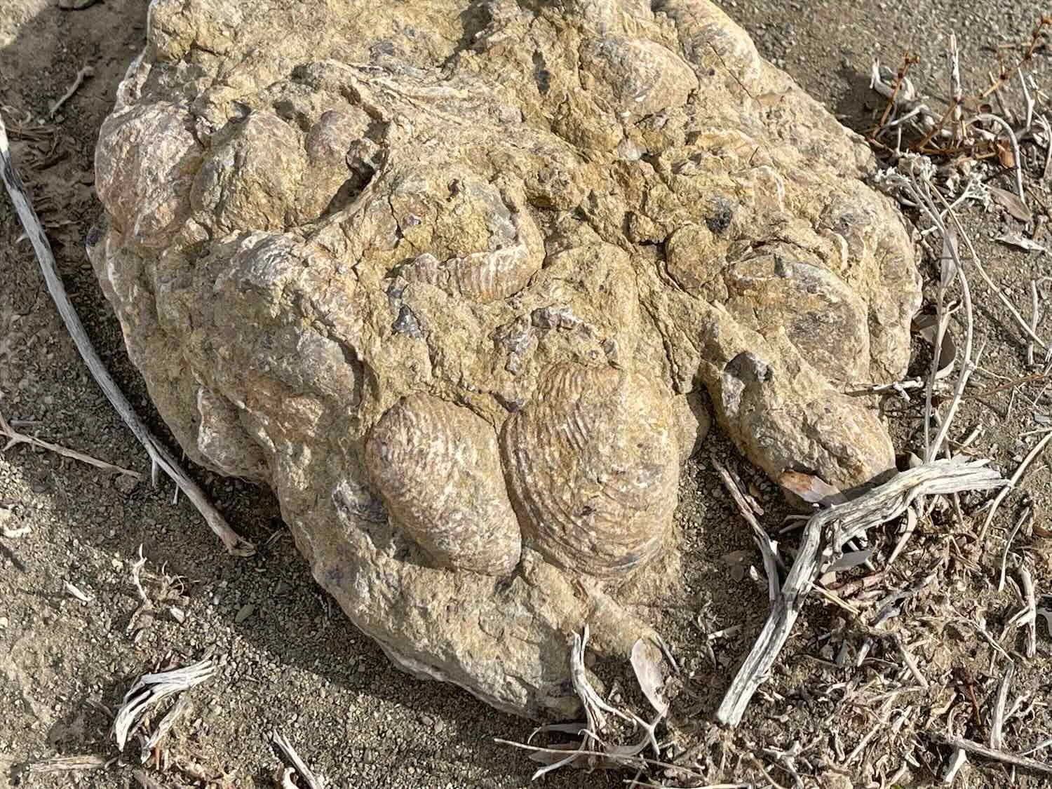 A rock encrusted with fossil clams indicated that this dry land was once a shallow sea. Route 40, Salado River Valley, South of Chorriaca, Neuquén, Argentina. Copyright © 2019-2025 Pedals and Puffins.