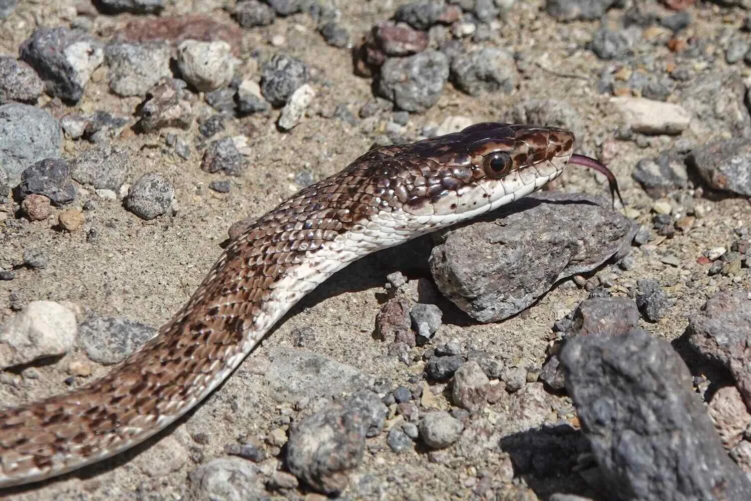 A closeup portrait of the mousehole snake. The species is endemic to Argentina. Although they are mildly venomous, the poison is weak and not considered particularly dangerous to humans. Route 40, South of Buta Ranquil, Neuquén, Argentina. Copyright © 2019-2025 Pedals and Puffins.