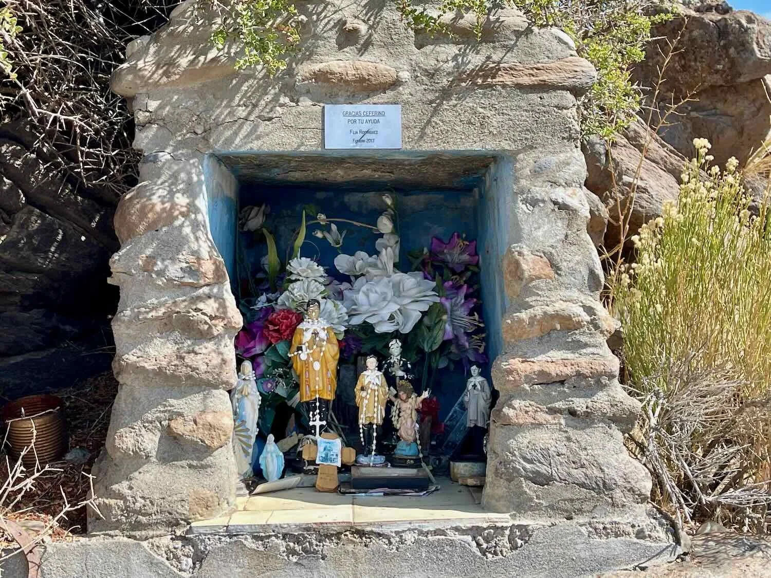 A roadside offering of thanks, now serving as a shrine for other travelers who seek blessings. Route 40, South of Las Lajas, Neuquén, Argentina. Copyright © 2019-2025 Pedals and Puffins.