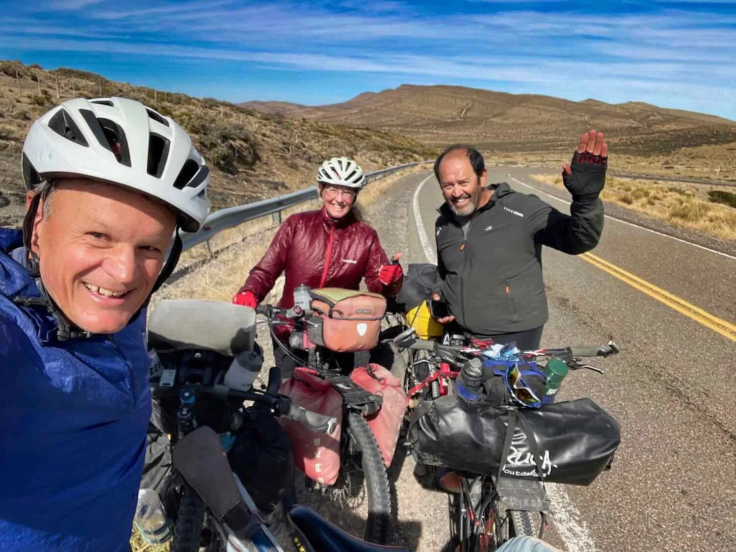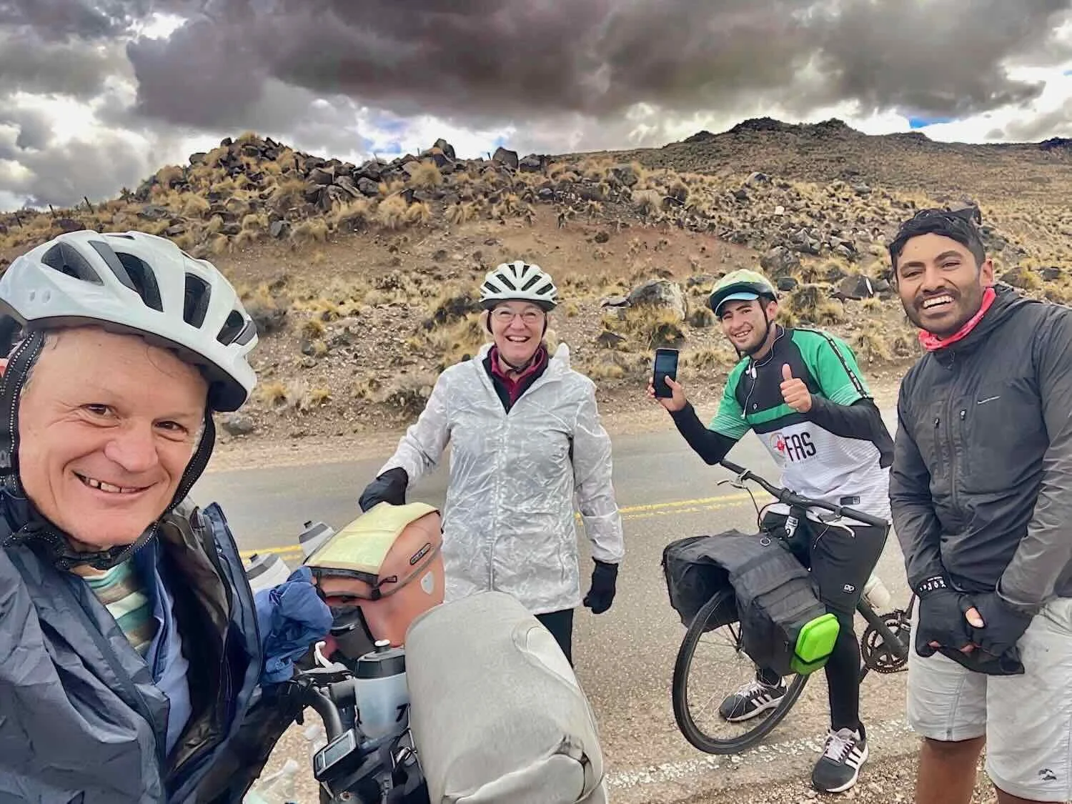 A quick, roadside visit with Daniel (from Argentina) and Ernesto (from Chile). Their boisterous energy was infectious. We were impressed that they were dressed light (note Ernesto’s shorts), while we were wearing multiple warm layers against the cold, damp air. Route 40, South of Zapala, Neuquén, Argentina. Copyright © 2019-2025 Pedals and Puffins.