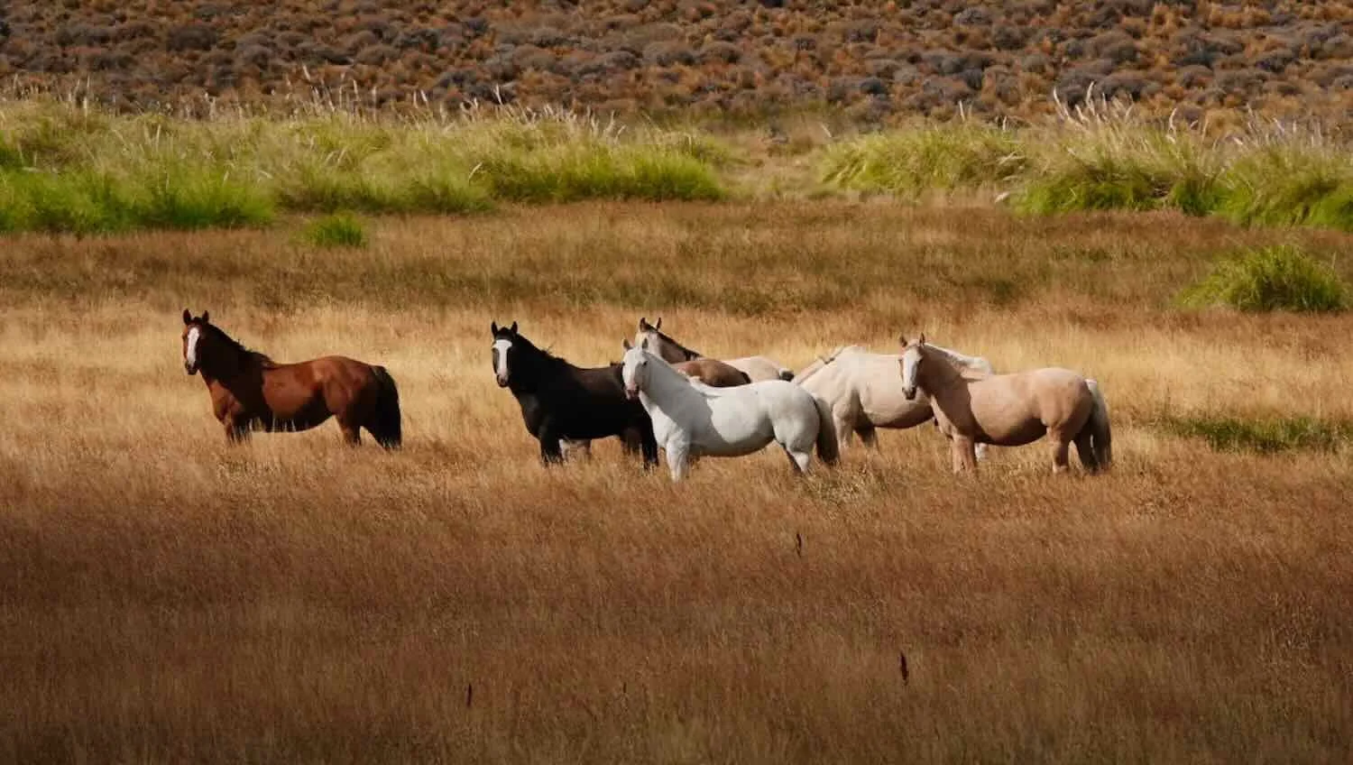 A herd of horses were intrigued by the sight of two cyclists passing by. The bushy, pale-green grass in the background was pampas grass. Route 40, North of Catán Lil, Neuquén, Argentina. Copyright © 2019-2025 Pedals and Puffins.