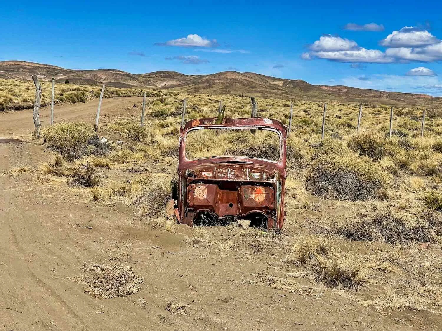 As we traversed the top of the plateau, we were struck by the sight of several rusting hulks of cars along the side of the road. It wasn’t something we had seen in Chile or the other parts of Argentina we had visited. We wondered if it was just too hard to rescue a broken down vehicle from this remote mesa, causing cars to be abandoned, left to slowly decay under the Patagonian sun. Route 40, South of Catán Lil, Neuquén, Argentina. Copyright © 2019-2025 Pedals and Puffins.