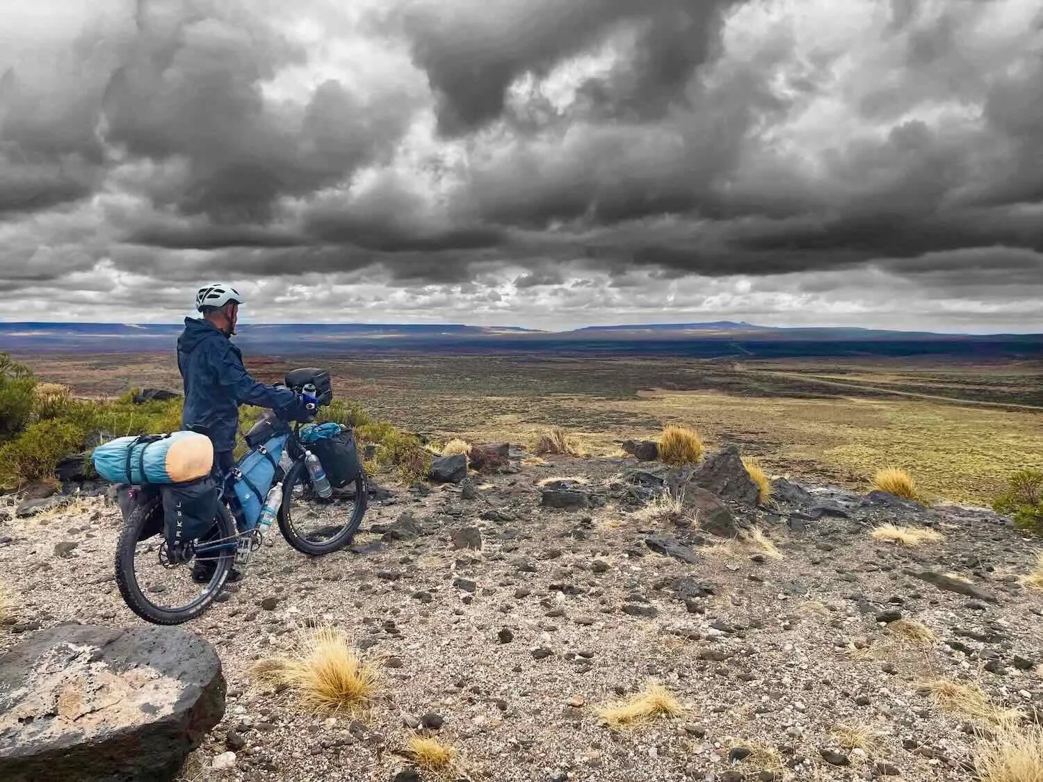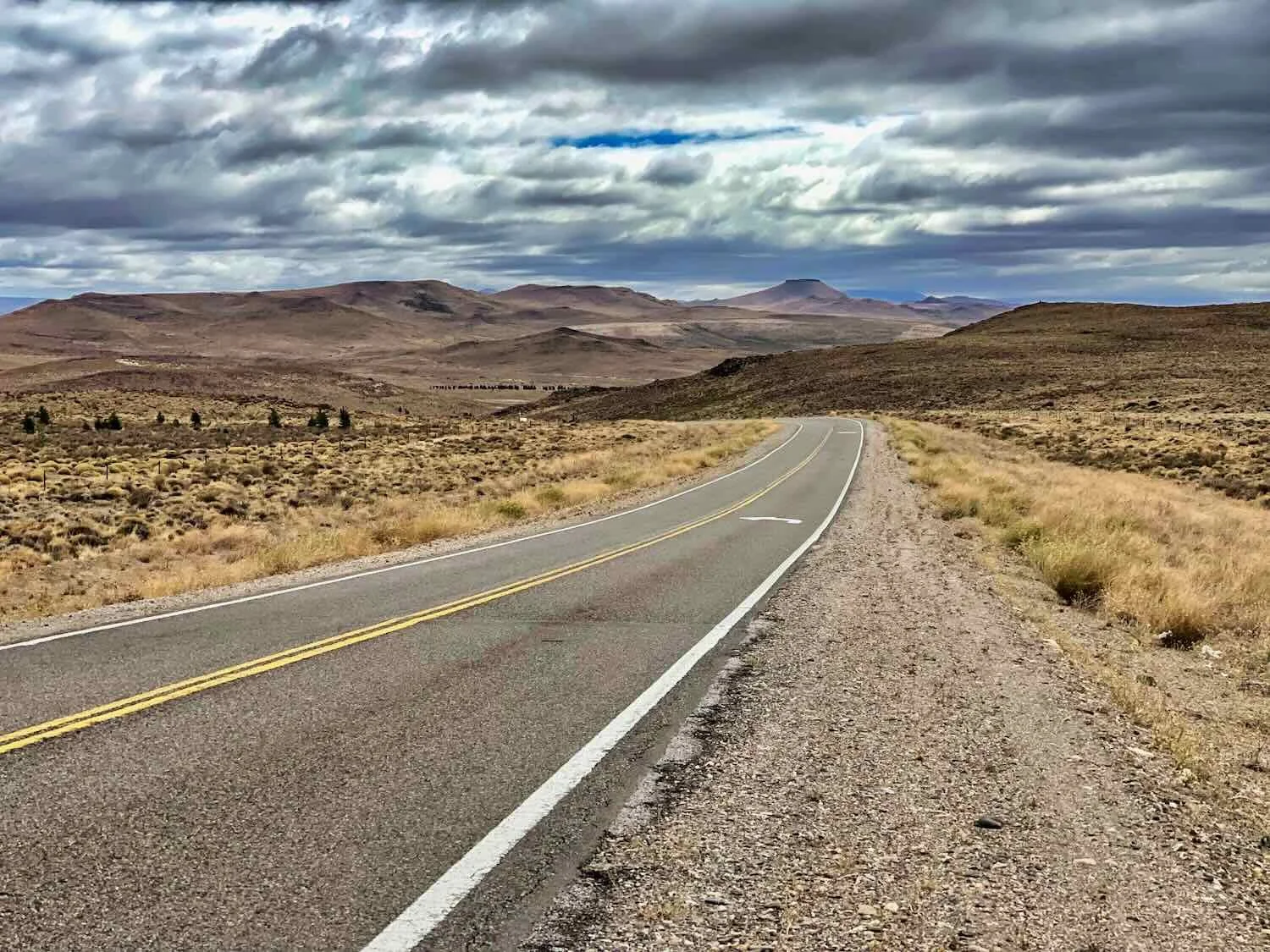 Ominous clouds gathered over the route ahead of us. Out on the pampas, there was nowhere to seek cover. Route 40, Near Estancia Don José, Neuquén, Argentina. Copyright © 2019-2025 Pedals and Puffins.