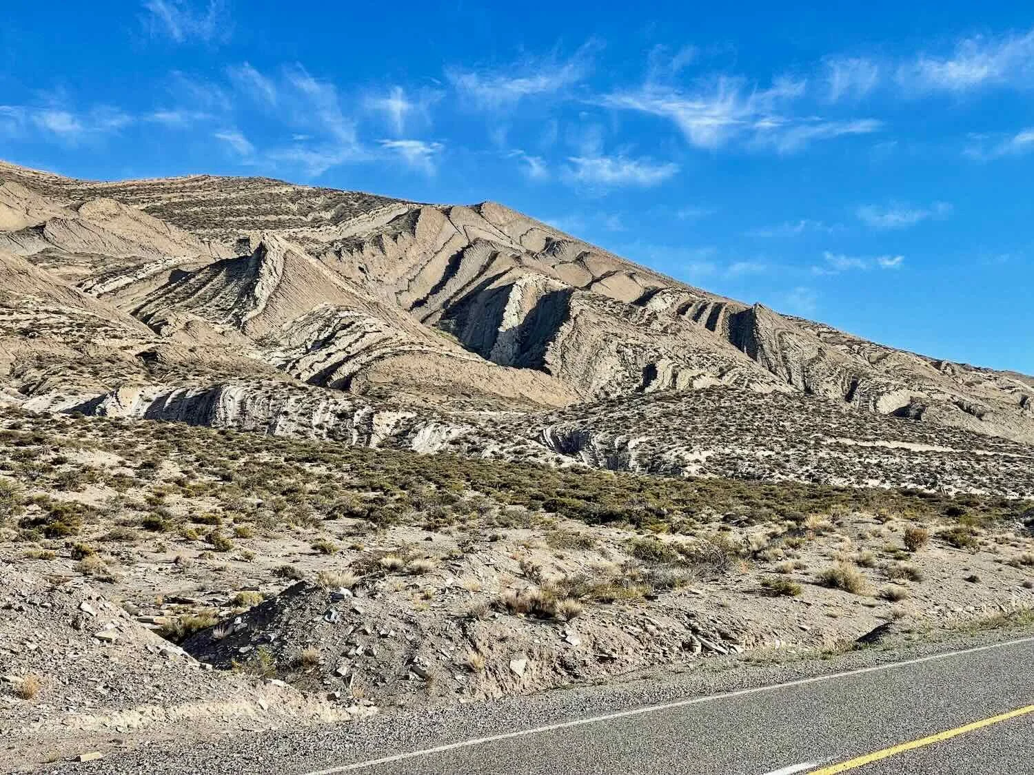 A strikingly bright, ivory-colored layer of rock looked like a vein of volcanic tuff - rock that formed from volcanic ash that fell millions of years ago. Route 40, East of Auquinco, Neuquén, Argentina. Copyright © 2019-2025 Pedals and Puffins.