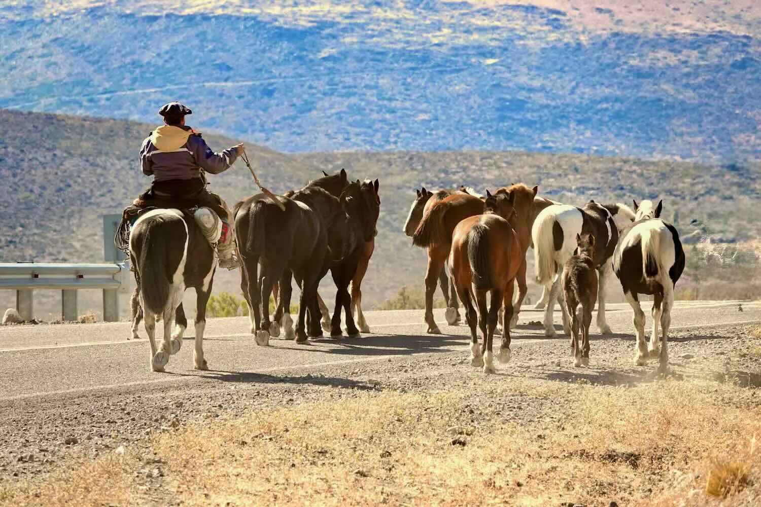 A gaucho herded his horses along the highway. Route 40, Near La Salada, Neuquén, Argentina. Copyright © 2019-2025 Pedals and Puffins.