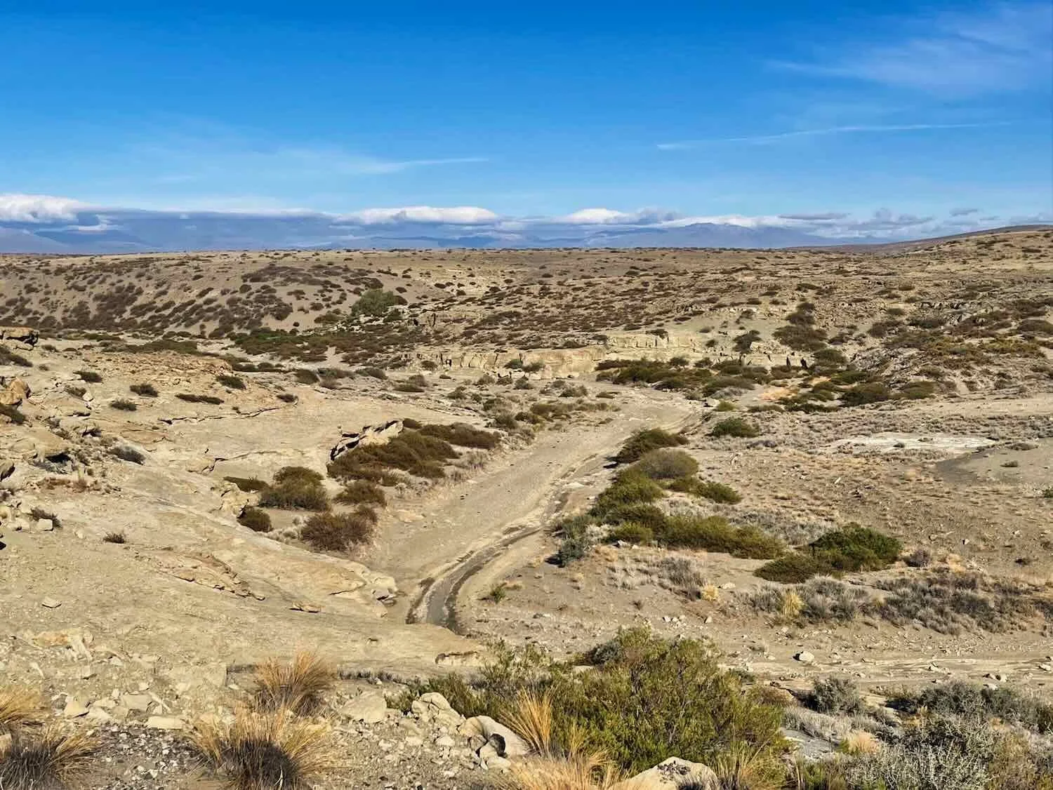The road out of Las Lajas headed eastward, taking us further away from the mountain foothills and out into the desert. For two hours we cycled deeper onto the increasingly arid landscape, before turning north again. But along the way there was evidence that this region wasn’t always so dry. In one sandy arroyo, the petrified trunks of large, Triassic era trees could be found among the gravel layers. At that time early dinosaurs wandered among the big trees that lined major water courses, before the continents of Africa and South America split apart. Further along our route the fossils time-traveled to the Cretaceous era 50-million years later, when the climate was much warmer and central Argentina was a shallow ocean. The fossil clams would have lived their lives buried in the sandy bottom of this shallow sea.