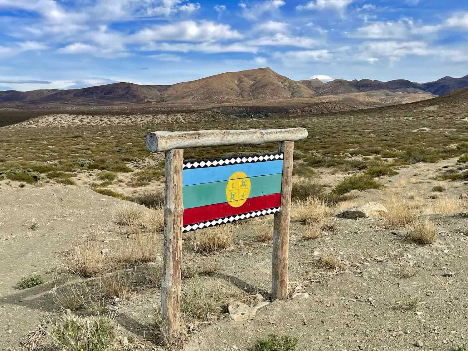 Along the route to the top of a ridge, we passed the small village of Chorriaca - a traditional Mapuche community that governs their communal land following ancestral practices. This sign by the road, which had no text, was the only indicator of where to turn to reach the village. Route 40, Chorriaca Junction, Neuquén, Argentina. Copyright © 2019-2025 Pedals and Puffins.