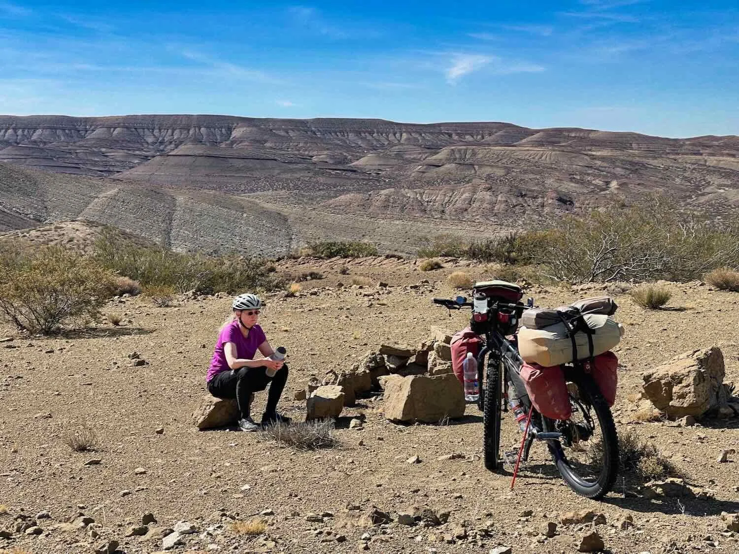 Pondering the tranquility of the landscape, and how hard that last hill was to get up. On a ridge that bordered the Salado River Valley. Route 40, East of Las Lajas, Neuquén, Argentina. Copyright © 2019-2025 Pedals and Puffins.