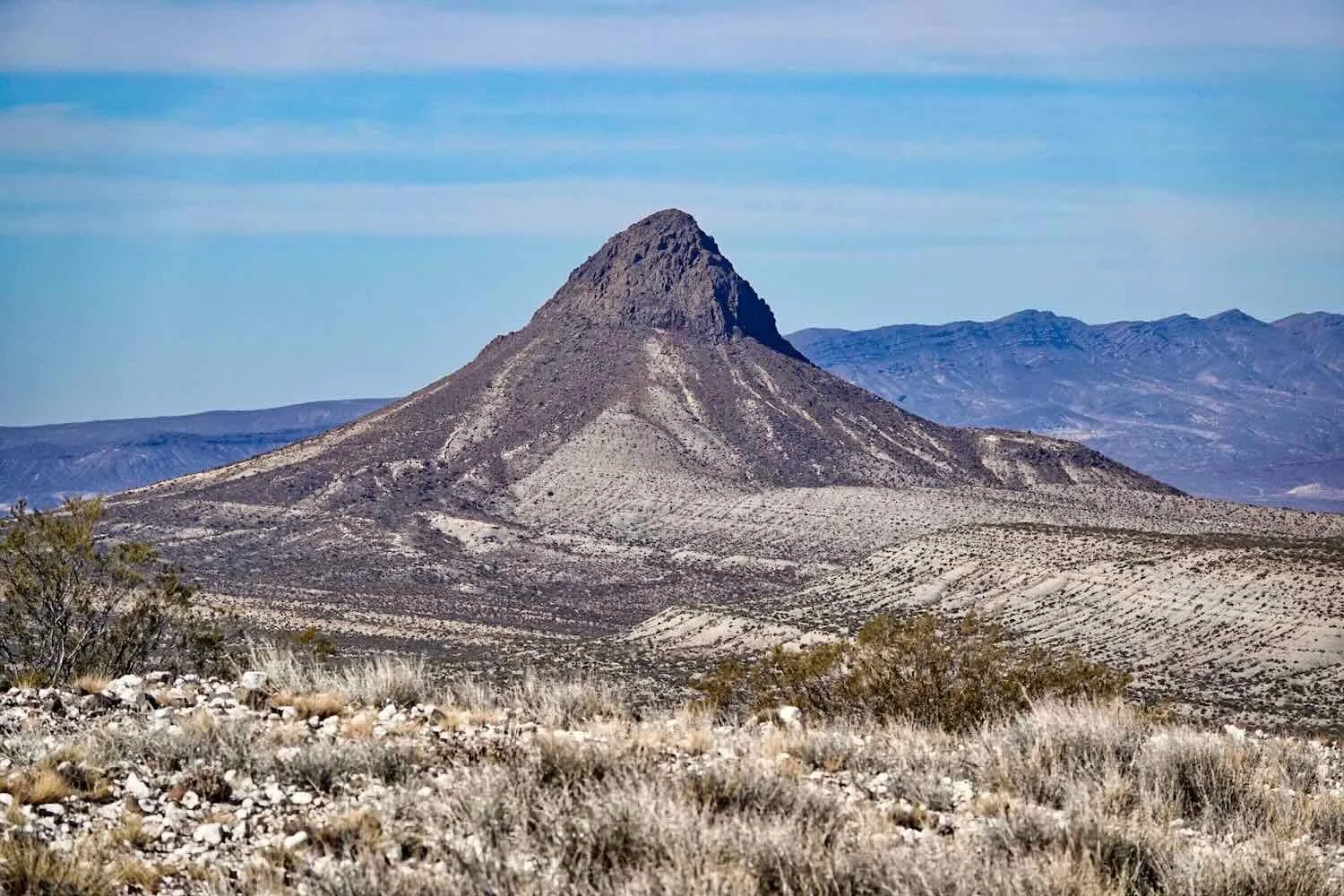 The distinctive, pointy profile of the Cerro Chihuido de Tril really stood out. Its hard, volcanic core was surrounded by a sloping skirt of looser debris. Route 40, South of Buta Ranquil, Neuquén, Argentina. Copyright © 2019-2025 Pedals and Puffins.