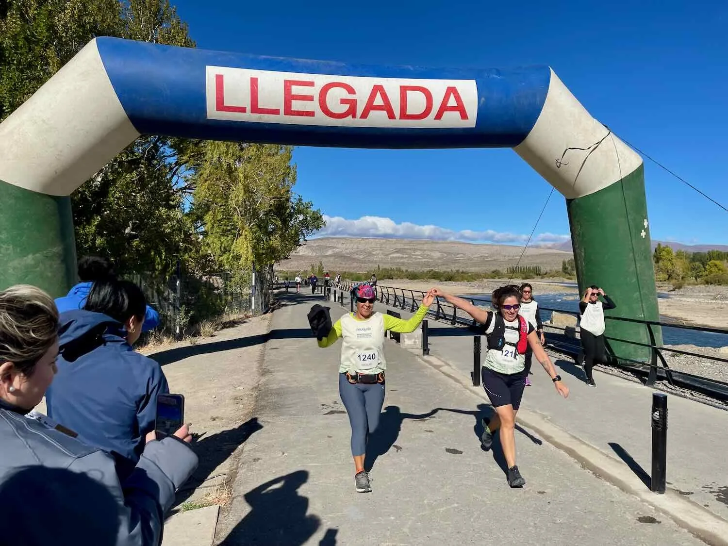A couple of runners victoriously cross the finish line of a 5K/10K race. Paseo Costanero, Chos Malal, Neuquén, Argentina. Copyright © 2019-2025 Pedals and Puffins.