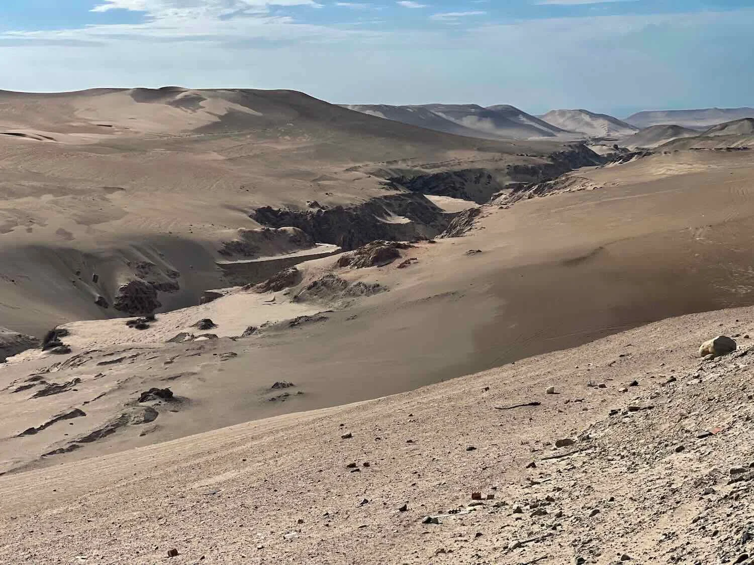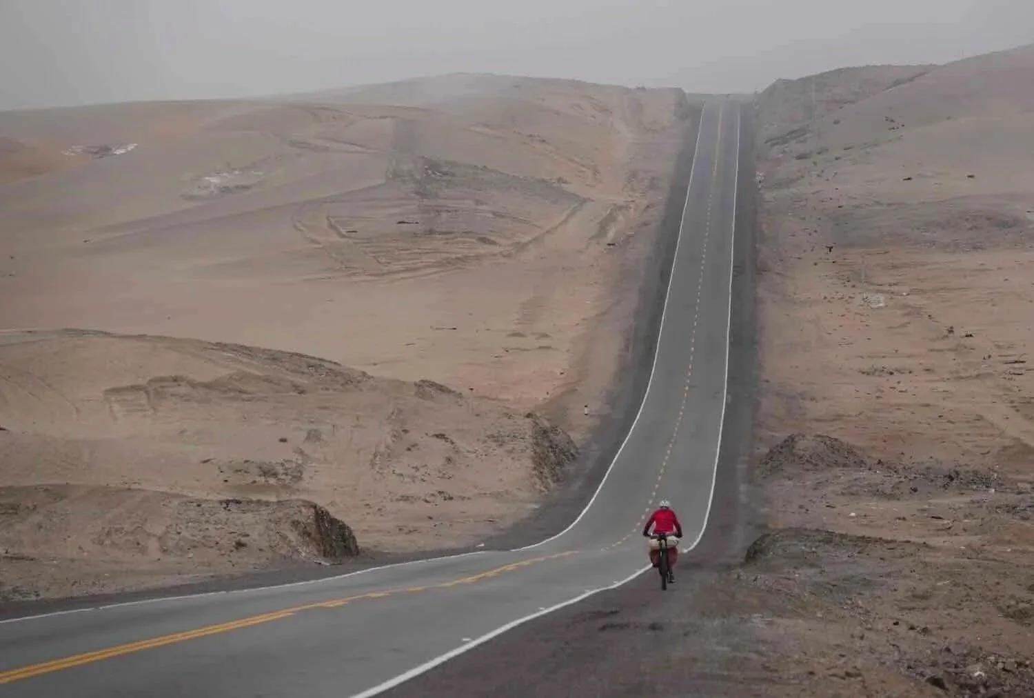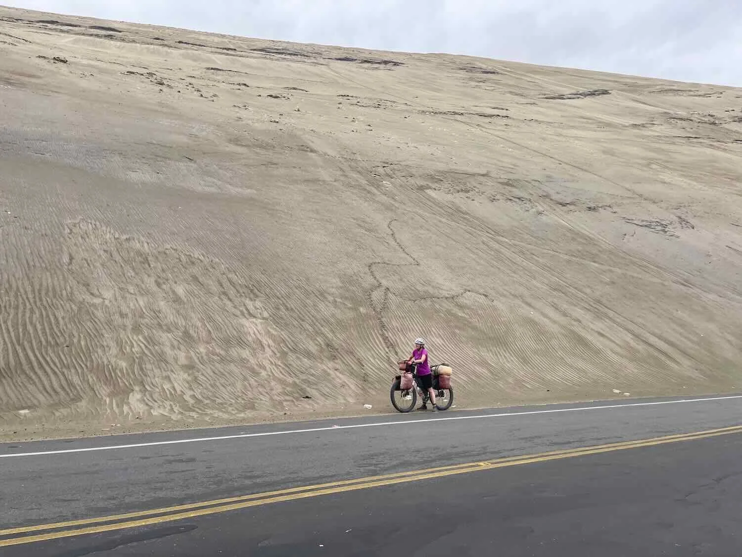 Emerging onto the top of a coastal headland plateau, we were surrounded by windswept sand dunes - their subtle colors further muted by the hazy air. Near Chira Cove, Pan-American Highway, Arequipa Department, Peru. Copyright © 2019-2026 Pedals and Puffins.
