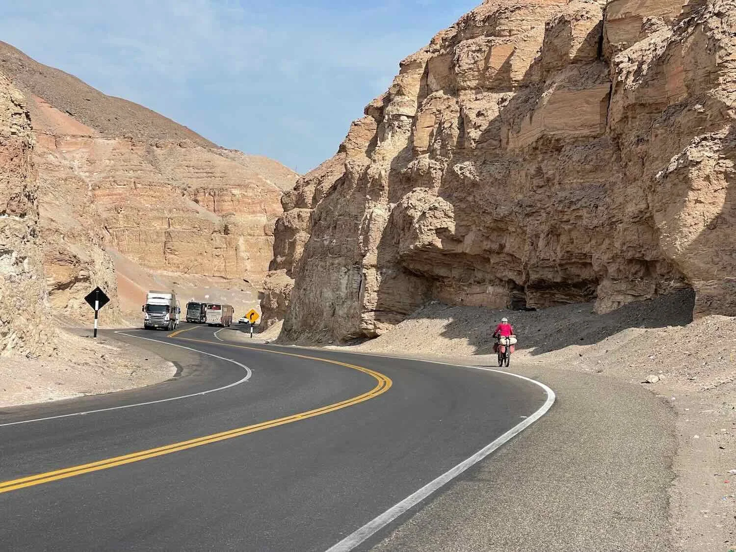 We spent time cycling adjacent to steep cliffs that rose up right next to the road. At least we were on the side of the road away from the drop-off into the sea. But sometimes the cliffs squeezed our road shoulder more than we liked. W of Ocoña, Pan-American Highway, Arequipa Department, Peru. Copyright © 2019-2026 Pedals and Puffins.