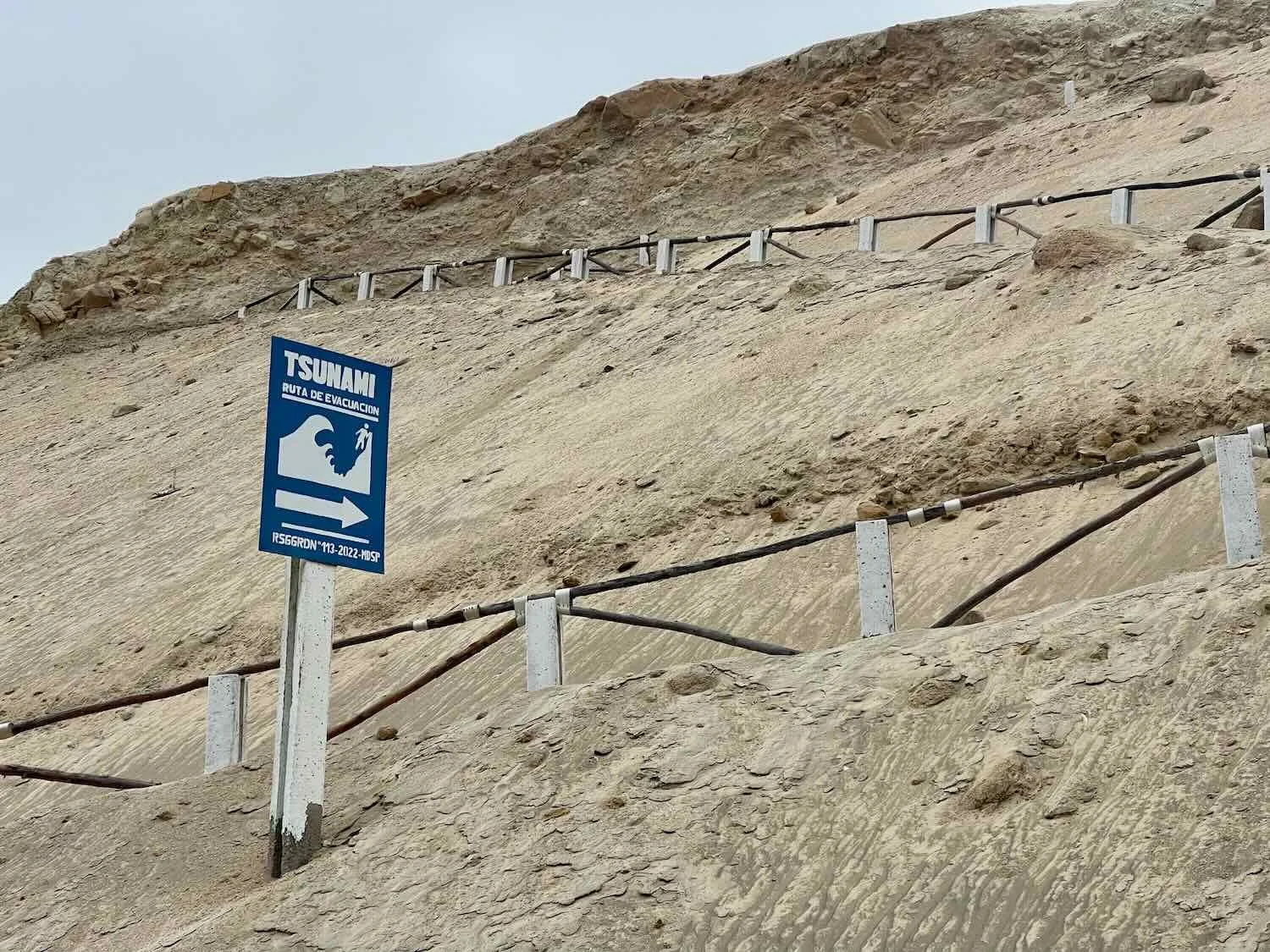 Another sign, at the base of a steeply climbing path, reminded us that Peru’s entire coastline is subject to dangerous tsunamis caused by offshore earthquakes. The path was an escape route. Playa Cerrillos, Camanà, Pan-American Highway, Arequipa Department, Peru. Copyright © 2019-2026 Pedals and Puffins.