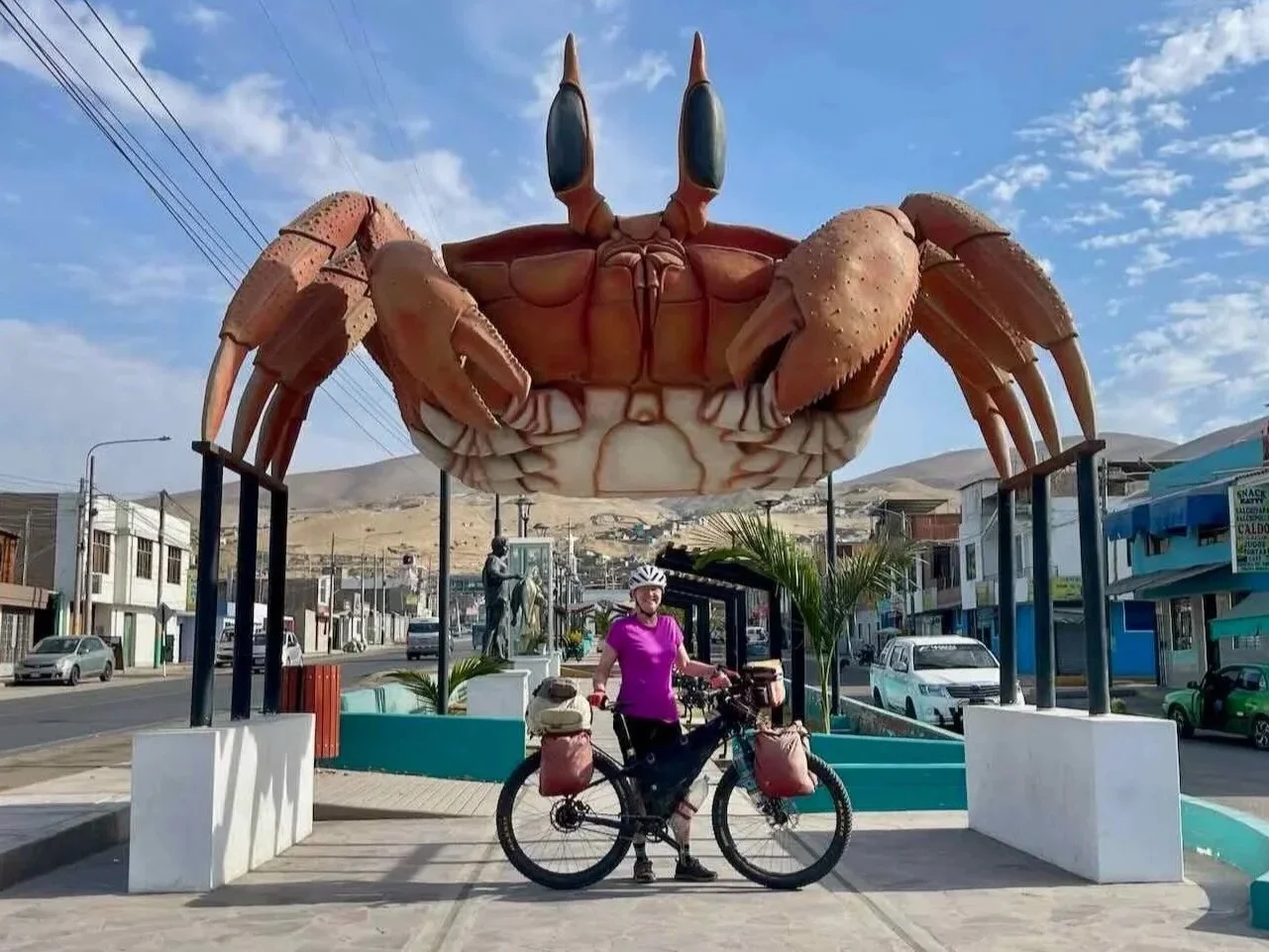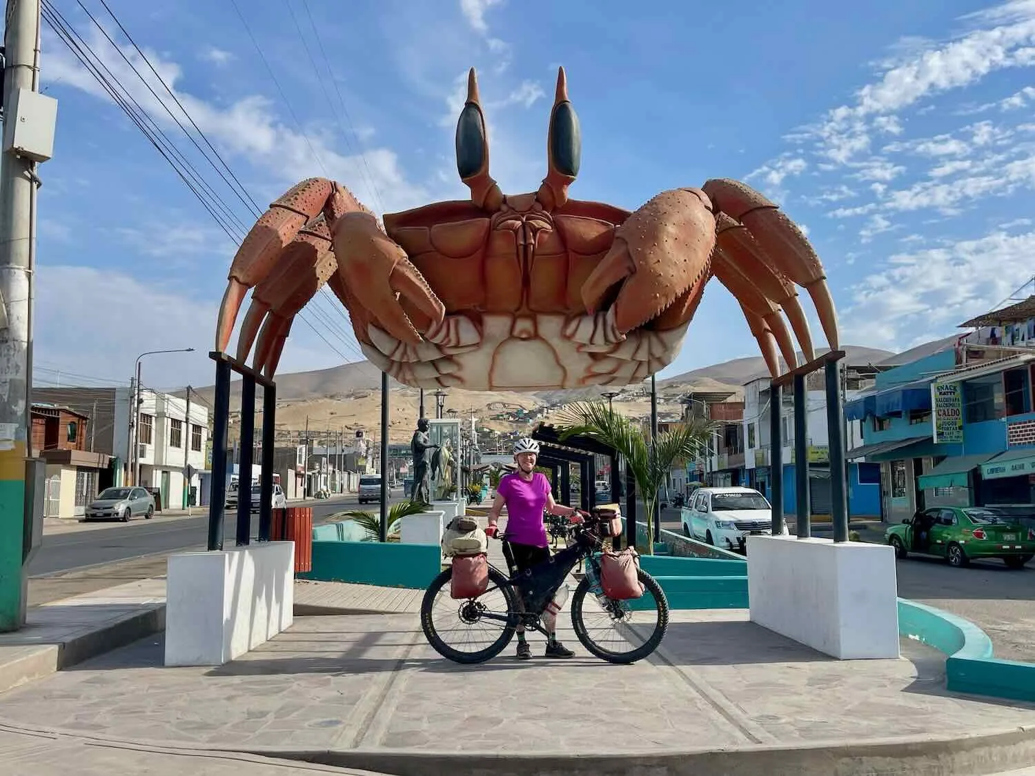 On our way out of town, we stopped for a photo with this statue of a Painted Ghost Crab (a resident of the local beaches). Camanà, Pan-American Highway, Arequipa Department, Peru. Copyright © 2019-2026 Pedals and Puffins.