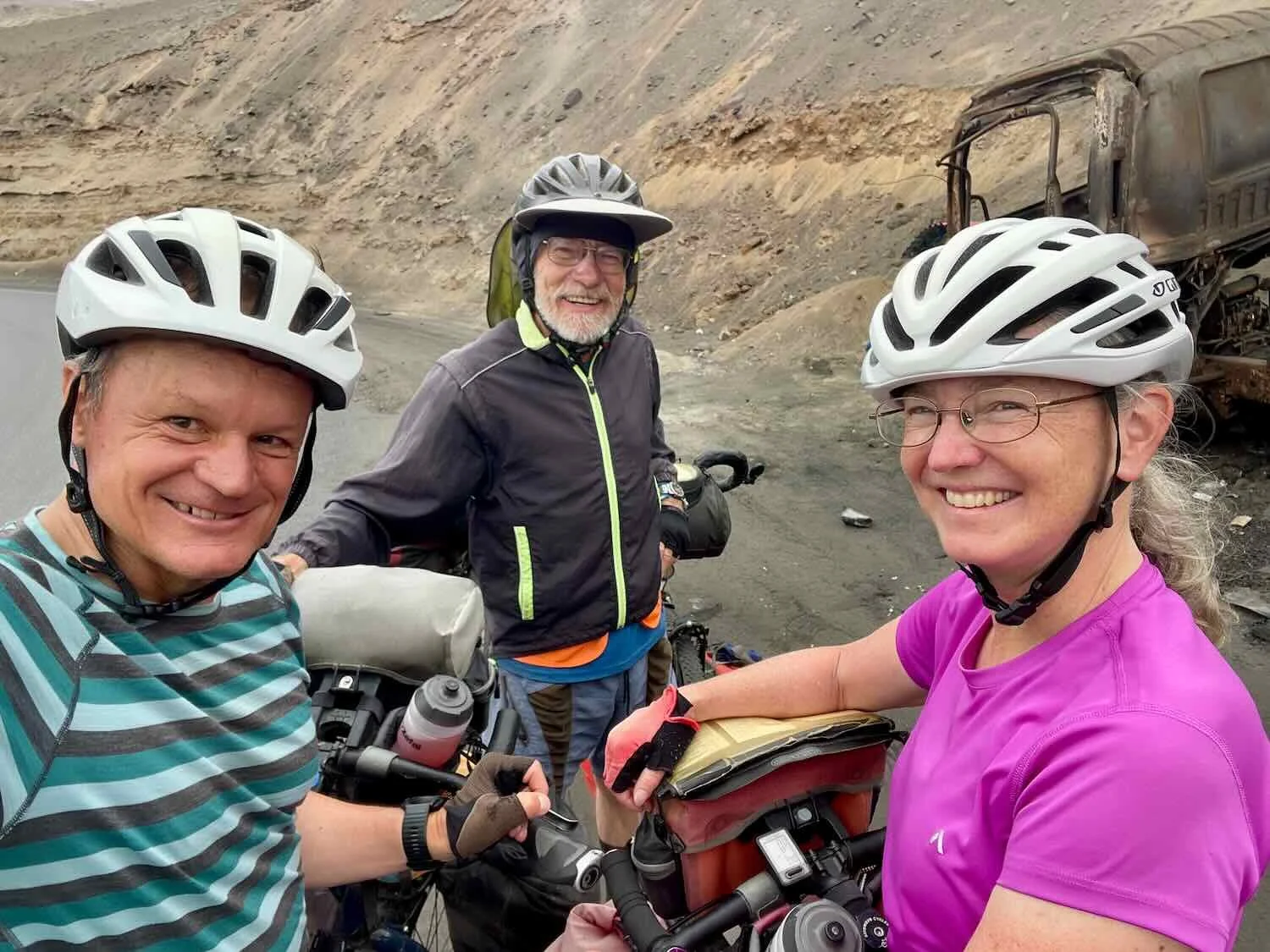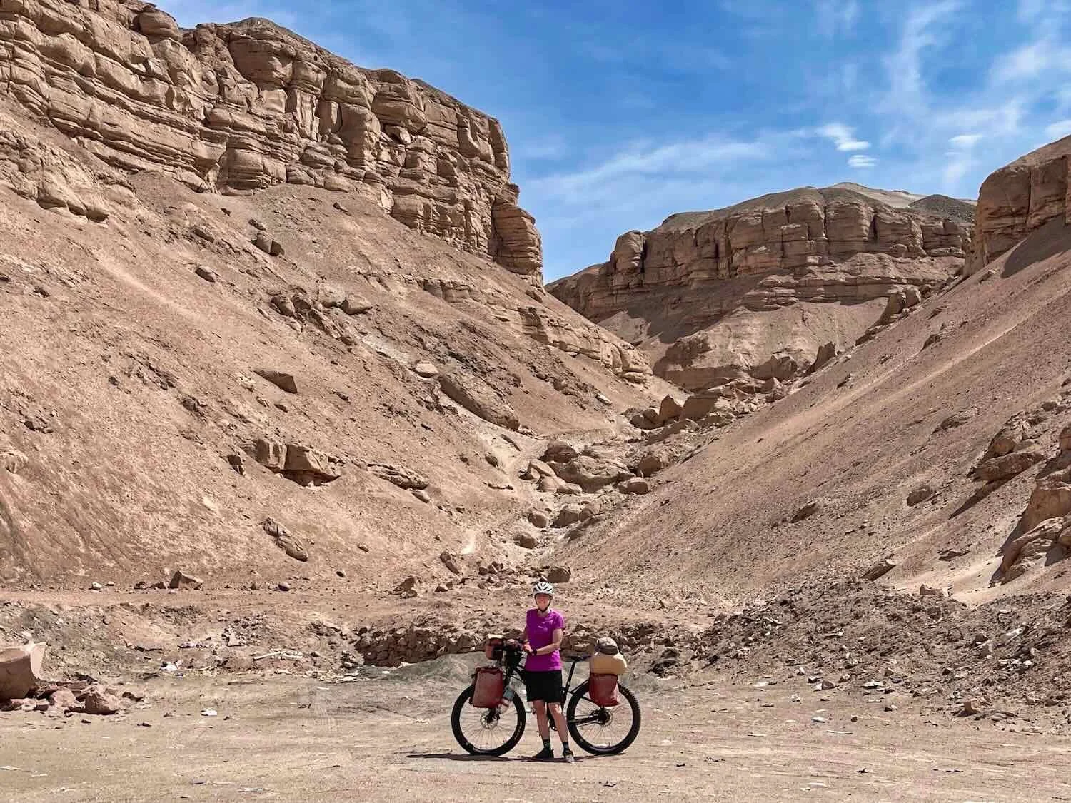 The mountains all around us were dusted with glistening, white sand that sometimes gathered into drifts. There even were a few, big sand dunes nestled against the hills. By that time the wind had picked up - blowing the sand into our eyes, noses, and even our ears. We both had flashbacks to when we had cycled across the Sahara Desert in Sudan, when fierce winds and blowing sand were a real nuisance.