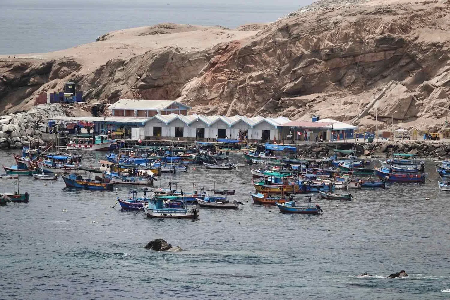 The harbor full of squid-fishing boats. The white buildings at the port were used for cold-storage and processing of the squid brought ashore. La Planchada, Pan-American Highway, Arequipa Department, Peru. Copyright © 2019-2026 Pedals and Puffins.