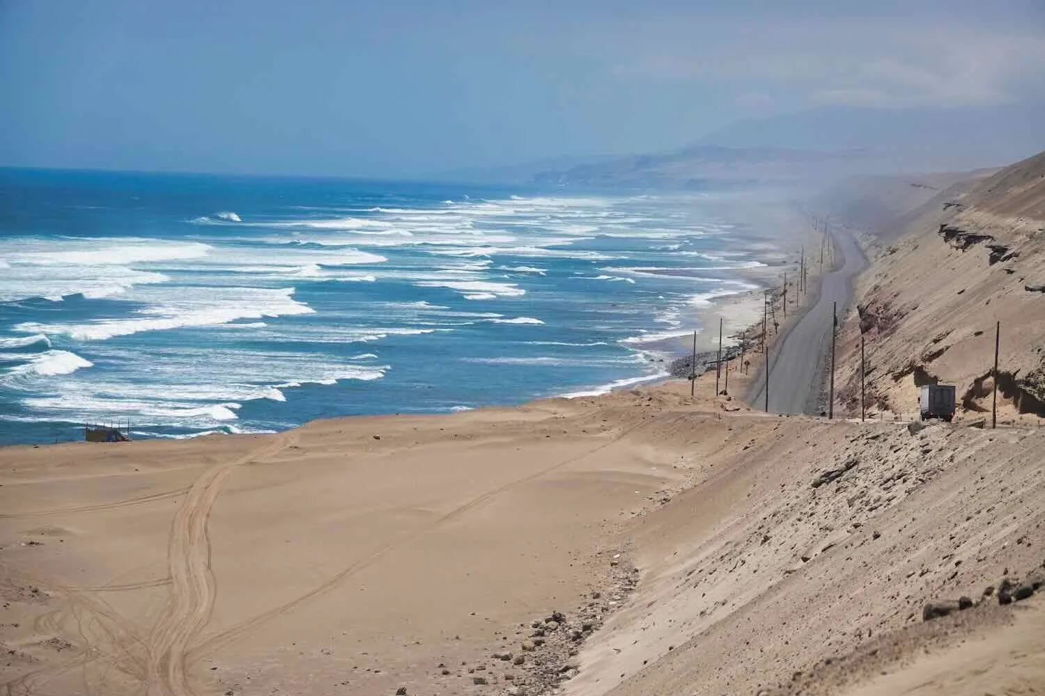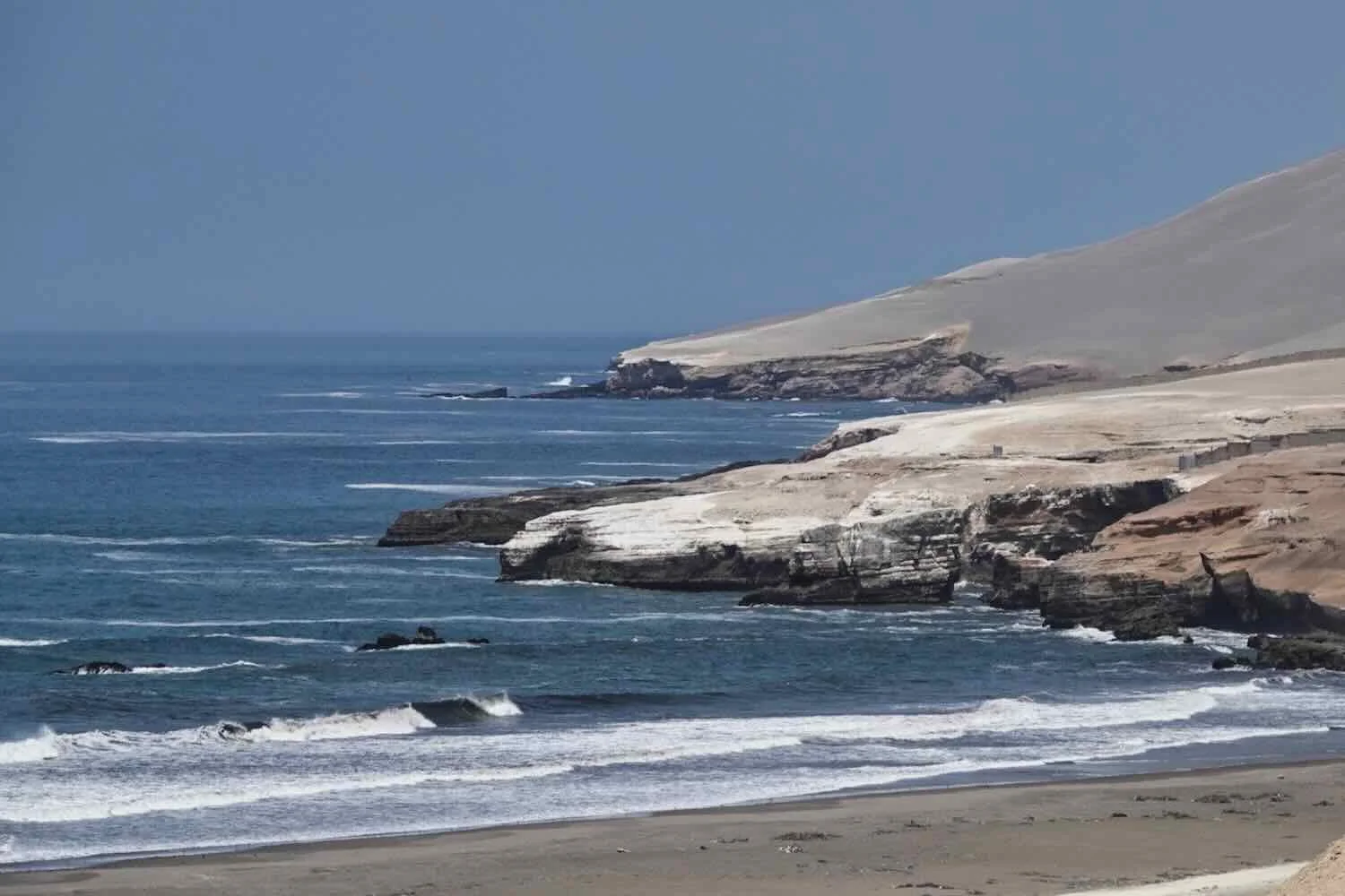 The pale, desert headlands contrasted with the indigo blue ocean, painting a gorgeous landscape of subtle hues. Playa La Chira, Pan-American Highway, Arequipa Department, Peru. Copyright © 2019-2026 Pedals and Puffins.