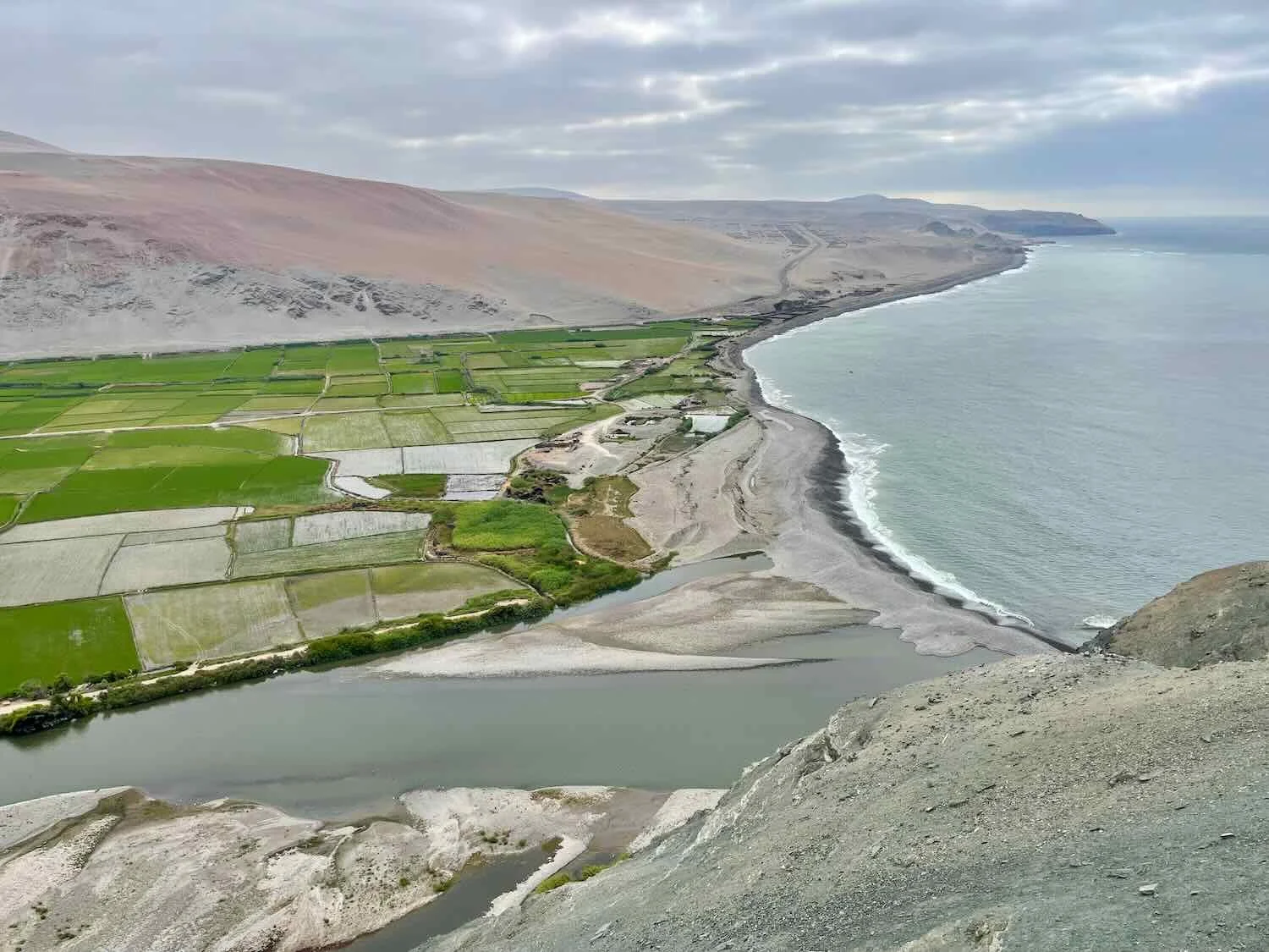 View of the mouth of the Ocoña River Valley from the heights of the Ocoña Cliffs. Much of the river water is used to irrigate the rice fields, turning the brown desert into green agricultural fields. Pan-American Highway, Arequipa Department, Peru. Copyright © 2019-2026 Pedals and Puffins.
